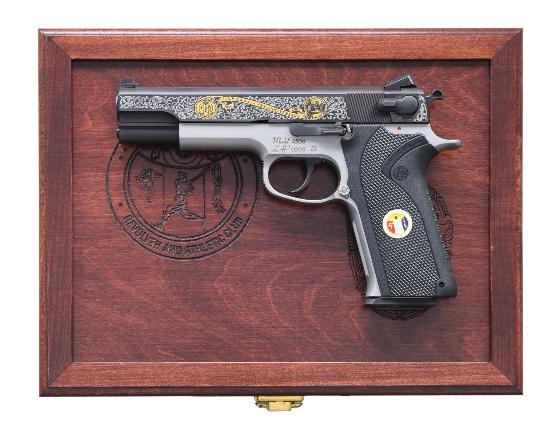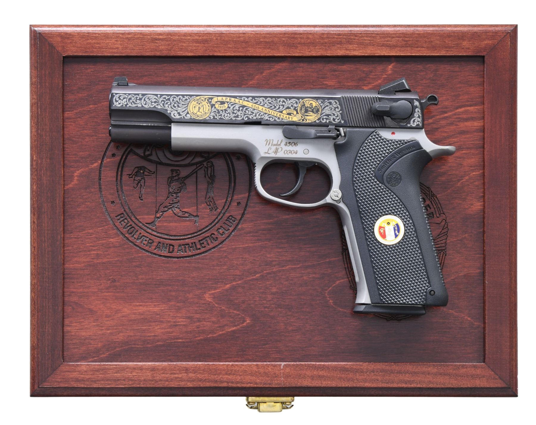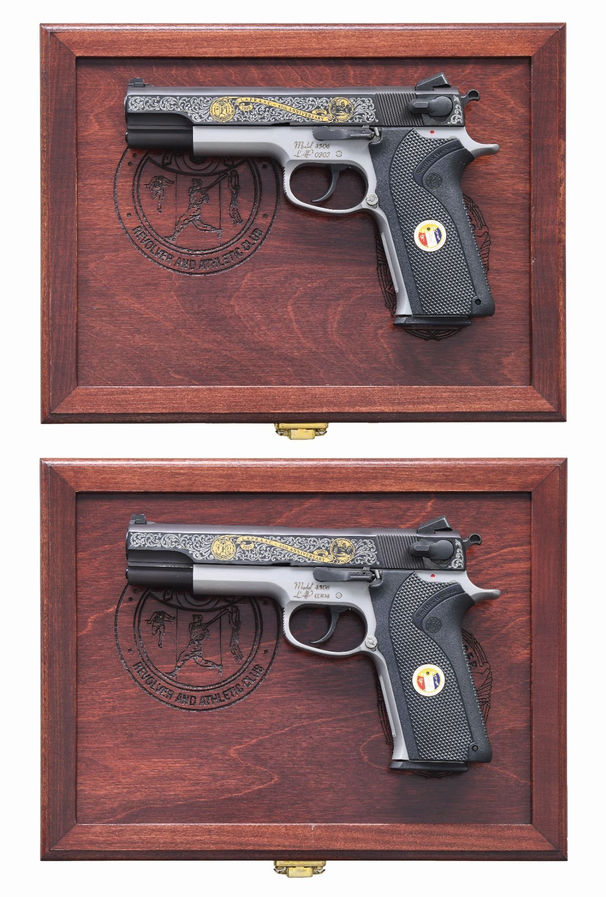 COMMEMORATIVE 4506 SEMI AUTO PISTOLS. Cal. 45 ACP. S's# LAP0303 & LAP0304. Bbls. 5". Three dot sights. Consecutive pair of LAPD 4506 Commemorative pistols. Only 500 pistols made in the year 2000 to commemorate the Los Angeles Police Revolver and Athletic Club's 65th Anniversary. Blued slides with scroll engraving & various LAPD badges. Stainless frames. Black checkered grips with S&W monograms & two LAPD discs. MAGS: 4-8 rd. all with LAPD discs on baseplates. UNATTACHED ACCESSORIES: two matching numbered factory hardcase with trigger locks, two rosewood display cases & shipping cartons. CONDITION: all aspects of both pistols near excellent. (25-244 & 25-245/MJC). MODERN. $2000-3000.