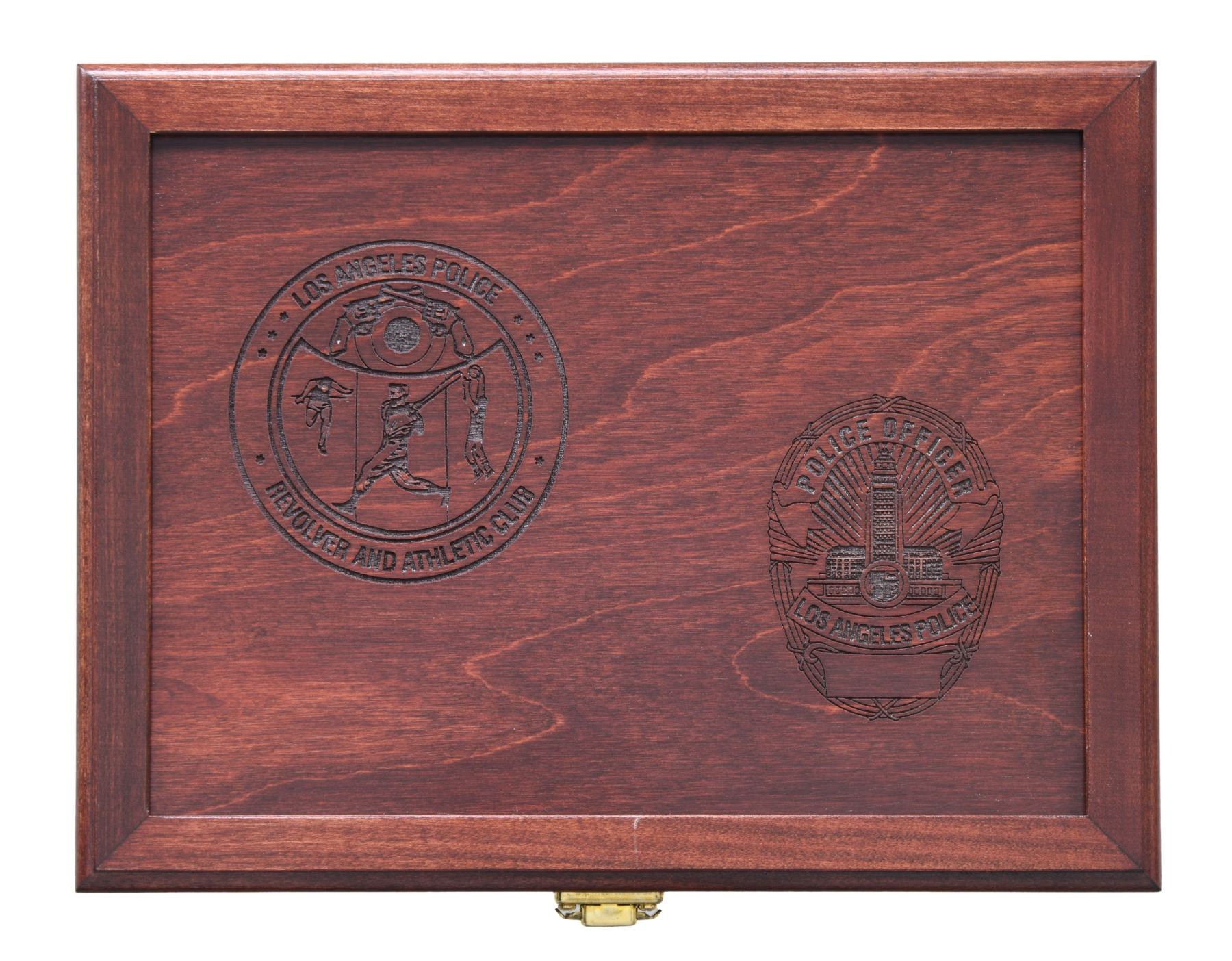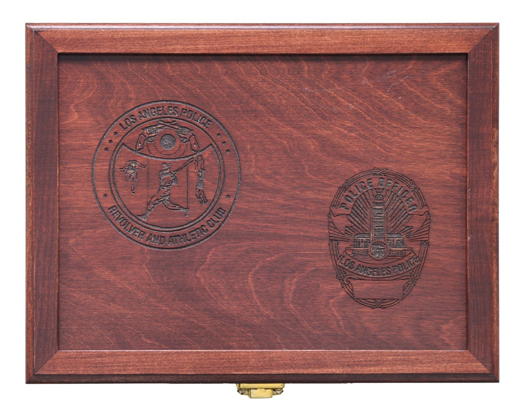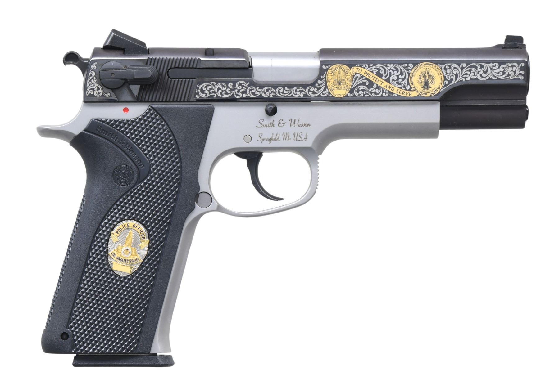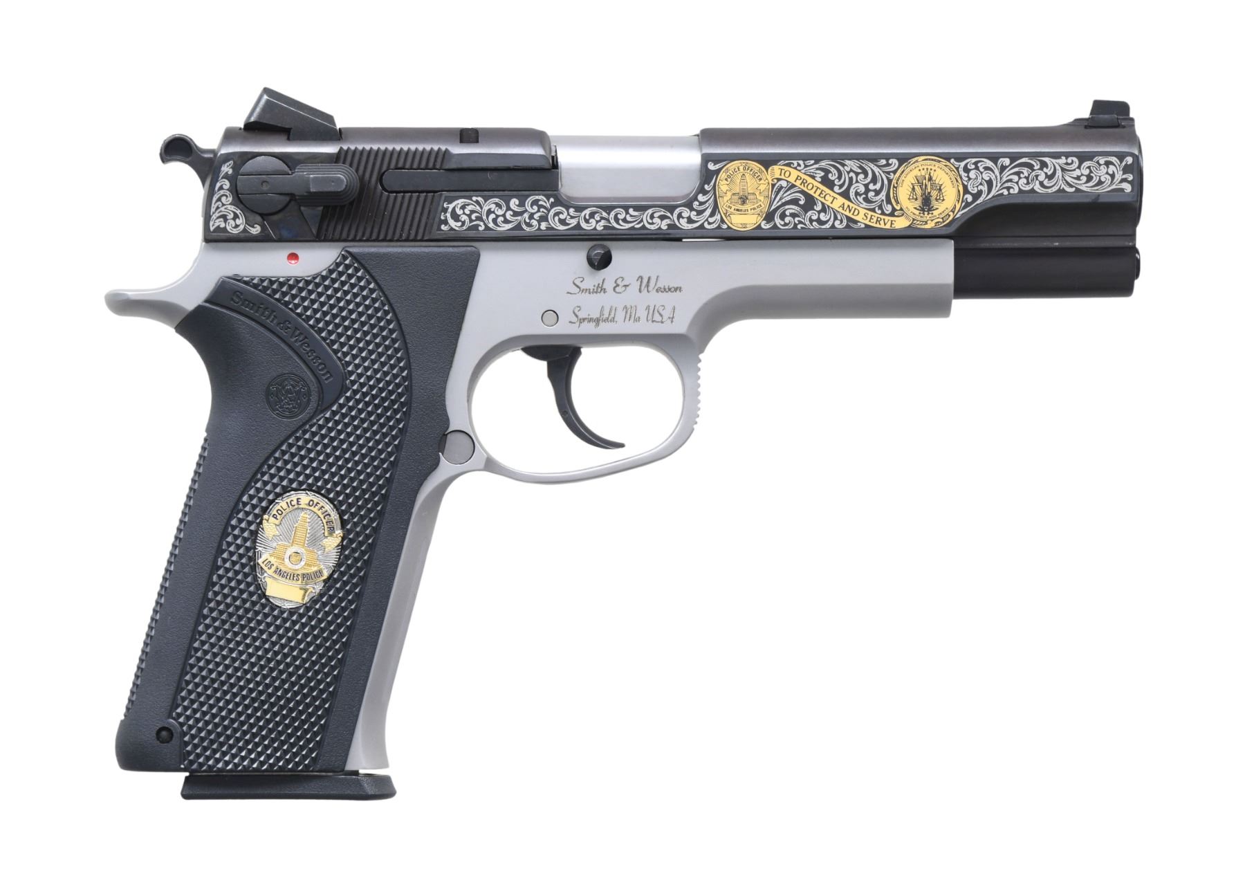 COMMEMORATIVE 4506 SEMI AUTO PISTOLS. Cal. 45 ACP. S's# LAP0303 & LAP0304. Bbls. 5". Three dot sights. Consecutive pair of LAPD 4506 Commemorative pistols. Only 500 pistols made in the year 2000 to commemorate the Los Angeles Police Revolver and Athletic Club's 65th Anniversary. Blued slides with scroll engraving & various LAPD badges. Stainless frames. Black checkered grips with S&W monograms & two LAPD discs. MAGS: 4-8 rd. all with LAPD discs on baseplates. UNATTACHED ACCESSORIES: two matching numbered factory hardcase with trigger locks, two rosewood display cases & shipping cartons. CONDITION: all aspects of both pistols near excellent. (25-244 & 25-245/MJC). MODERN. $2000-3000.
