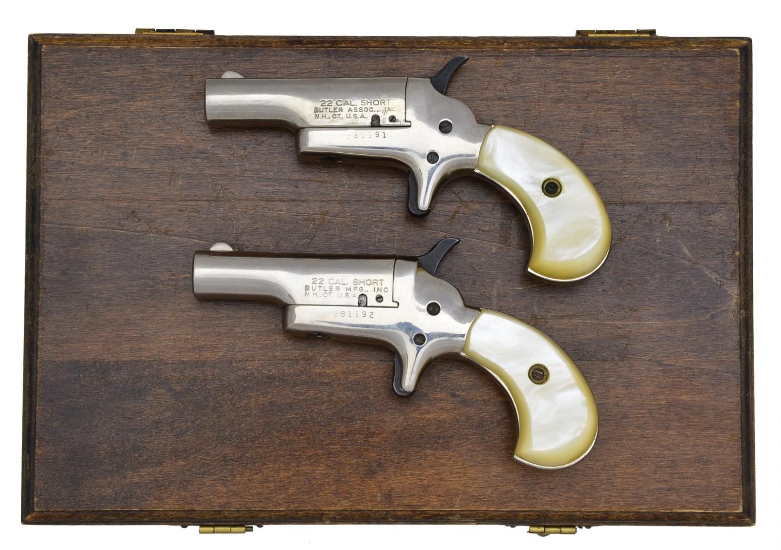 ALL: cal. 22 Short. Bbls. 2 1/2" w/ blade front sights. Nickel finished spur trigger actions. Bbls. rotate right for loading. 2 Piece synthetic pearl grips. UNATTACHED ACCESSORIES: wood box w/ fitted red interior. CONDITION: both retain over 98% nickel finish. Very good grips. Sound mechanics. Bore shows sm. spots of very light pitting.