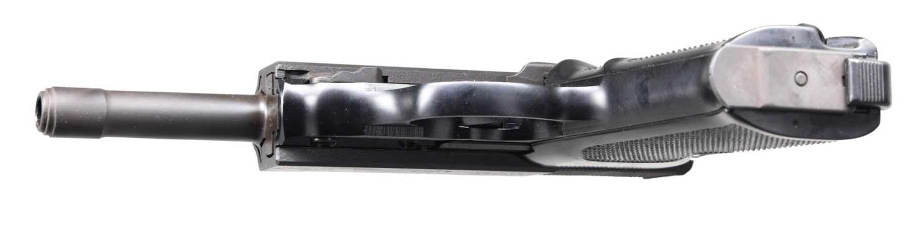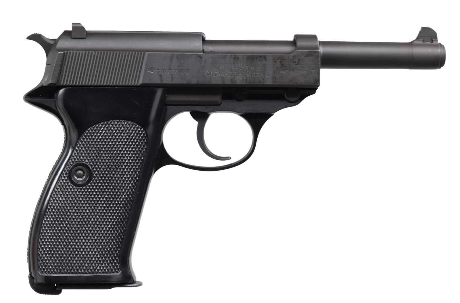 SEMI-AUTOMATIC PISTOLS WITH MATCHING FACTORY BOXES & PAPER TEST TARGETS. 1) Cal. 9x19mm Parabellum, S# 390701. Bbl. 5", P.38 semi-automatic pistol, mfg. by Walther in 1976. Left side of the slide is marked with the Walther banner logo, followed by markings stipulating Walther's mfg. information as well as the model and cal. designations., with the S#, Interarms' importer information, and "MADE IN GERMANY" marked on the right side. Left side of the frame is marked with the 2-digit year of mfg. "76" followed by an Ulm Proof House antler stamp above a German Eagle/N commercial nitro proof. Aluminum frame exhibits a black anodized finish, with the slide and bbl. exhibiting a matte gray finish. Frame is mounted with 2-piece checkered black plastic grips. MAGS: 2-8-rd. UNATTACHED ACCESSORIES: matching factory box, containing factory paperwork, a matching factory paper test target, as well as 1 spare mag. and a cleaning rod. CONDITION: excellent, with metal components retaining bountiful amounts of their original factory finishes, exhibiting few light superficial handling marks overall. Brilliant mirror bore, exhibiting well-defined rifling throughout. Grips exhibit a few light marks from handling and storage but are otherwise very good overall. Box shows some light exterior wear but otherwise remains sturdy and serviceable. (23-4144/MLW). 2) Cal. 9x19mm Parabellum, S# 390700, Bbl. 5", P.38 semi-automatic pistol, mfg. by Walther in 1976. Left side of the slide is marked with the Walther banner logo, followed by markings stipulating Walther's mfg. information as well as the model and cal. designations., with the S#, Interarms' importer information, and "MADE IN GERMANY" marked on the right side. Left side of the frame is marked with the 2-digit year of mfg. "76" followed by an Ulm Proof House antler stamp above a German Eagle/N commercial nitro proof. Aluminum frame exhibits a black anodized finish, with the slide and bbl. exhibiting a matte gray finish. Frame is mounted with 2-piece checkered black plastic grips. MAGS: 2-8-rd. UNATTACHED ACCESSORIES: matching factory box, containing factory paperwork, a matching factory paper test target, as well as 1 spare mag. and a cleaning rod. CONDITION: excellent, with metal components retaining bountiful amounts of their original factory finishes, exhibiting few light superficial handling marks overall. Brilliant mirror bore, exhibiting well-defined rifling throughout. Grips exhibit a few light marks from handling and storage but are otherwise very good overall. Box shows some light exterior wear but otherwise remains sturdy and serviceable. PROVENANCE: the collection of Gun Sport Ltd., owned by Jon R. Thomas. (23-4145/MLW). BOTH MODERN. $1,750-2,500.