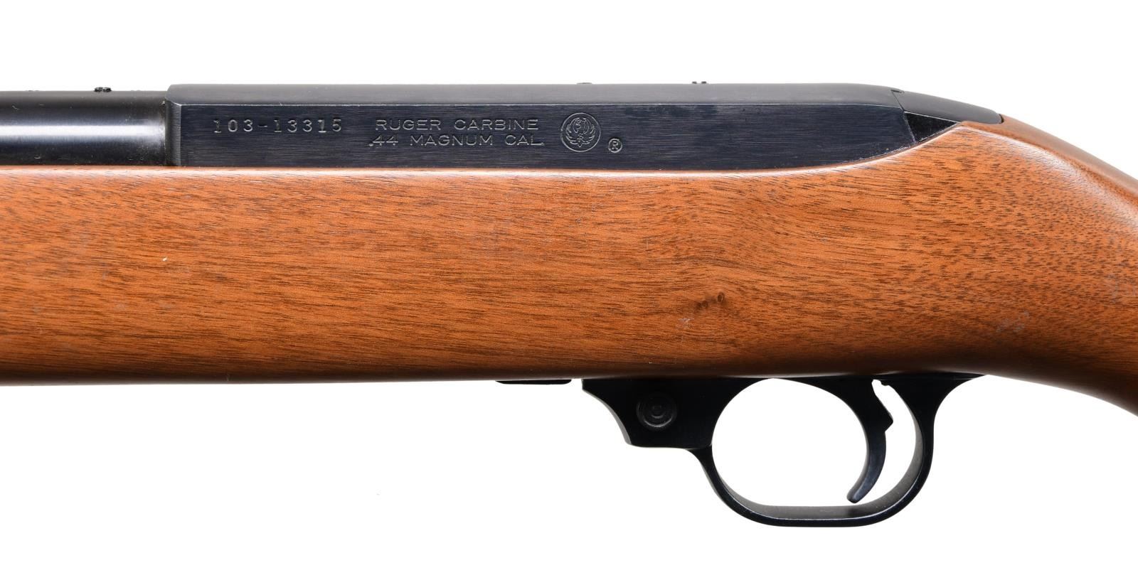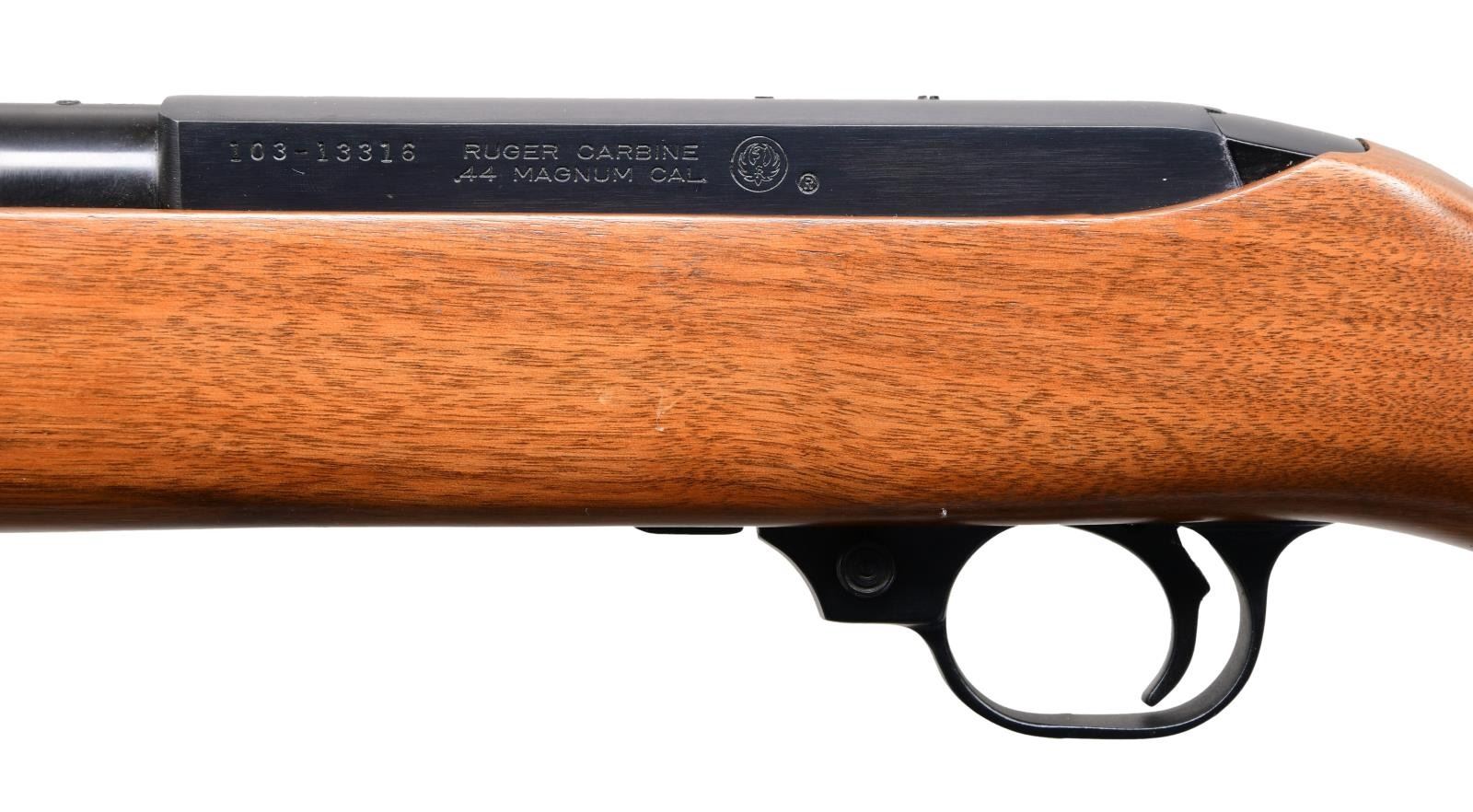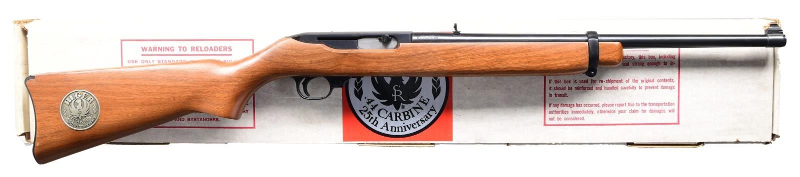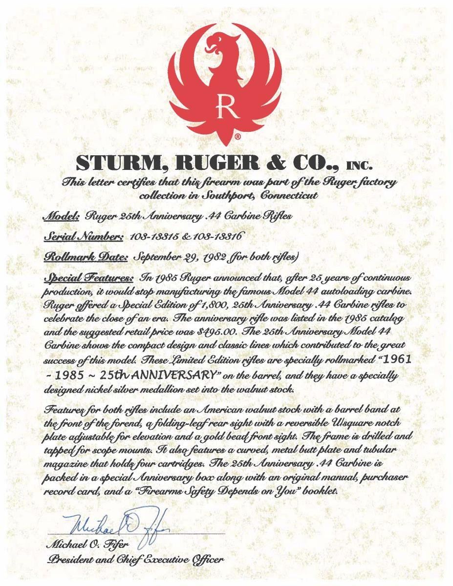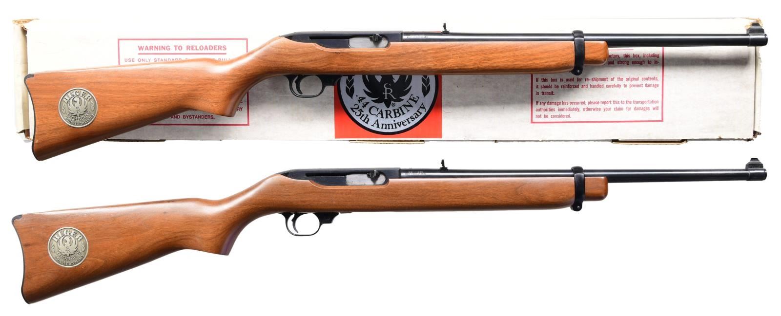 44R SEMI-AUTO CARBINES. BOTH: Cal. 44 Mag. Gun 1: S# 103-13316. Gun 2: S# 103-13315. Bbls. 18 1/2" with sights of brass bead fronts plus folding rears with white diamonds. Mfg. 1984 (1961-1985) per noted RENE Reference Guide yet factory letter signed by CEO Michael Fifer states they were roll marked Sept. 29, 1982. Factory letter states that Ruger announced there would be 1,800 units at $495 with American walnut stocks and metal buttplates (error in letter as Ruger used Celcon plastic buttplate for these, plus for all carbines starting in 1976). Factory Model number 01013 and catalog designation of YR25-44R. Approx. 5,000 Anniversary models produced per noted RENE Reference Guide as a result of cleaning up unsold inventory. Discontinuance was caused mainly by competition from noticeably less expensive Remington Model 742's aggressively marketed nationwide at large sporting goods outlets, etc. Shipped by Ruger in 2003 per Ruger website info; likely the result of a benefit auction. Anniversary markings on right side of barrel next to receiver plus "INC." and "warning marks" with its Southport address. Last variation with walnut stocks having square cut at forends and pewter colored Anniversary disks on right side of buttstocks. Cartridge release buttons at loading ports plus steel cartridge guides in top front of receivers held by 2 rivets rather than screws which were often confused by consumers to be a scope base provisions yet factory drilled and tapped at rear of barrels plus rear of receivers for scope mounting. In high demand as compact, fast handling brush hunting carbines that weigh less fully loaded (internal 4 rd. magazines) than the popular lever action carbine weighs empty. UNATTACHED ACCESORIES: original 25th Anniversary marked boxes with packaging to include original manuals (no red inked "out of production" marks) dated 4/82; outer mailing sleeve for #2 mailed to FFL in CO. Factory letter collectively listing both rifles plus supporting above information. CONDITION: there may be an occasional very faint stock handling mark but generally both are near excellent appearing new and unfired.