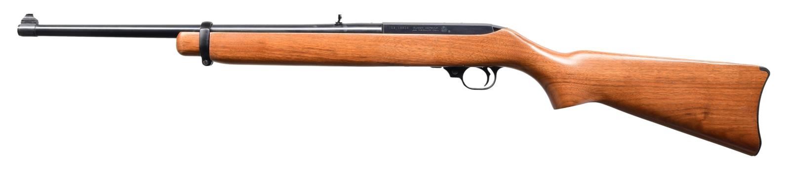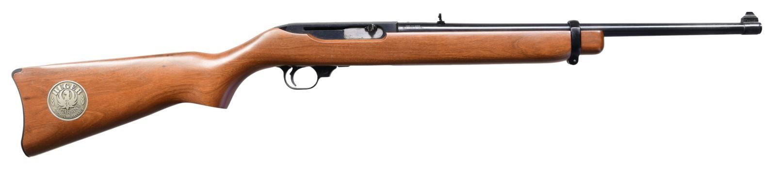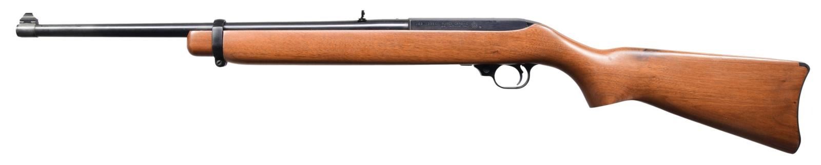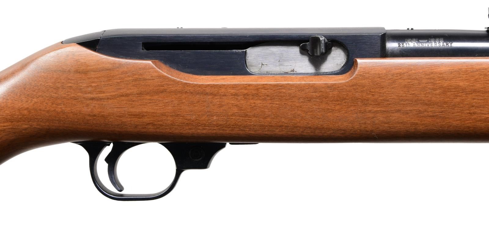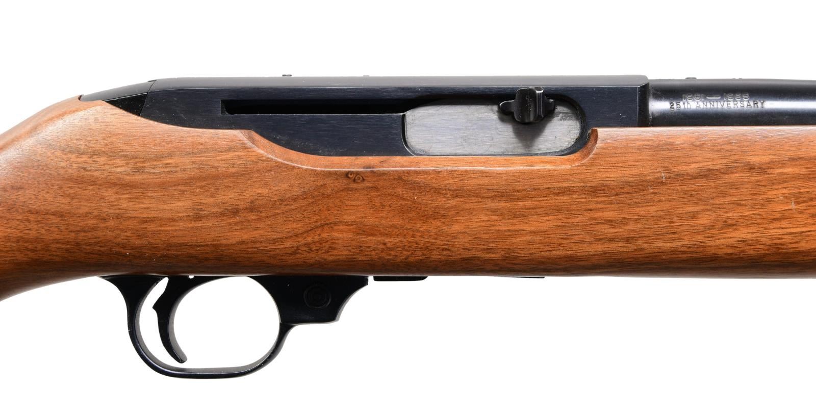 44R SEMI-AUTO CARBINES. BOTH: Cal. 44 Mag. Gun 1: S# 103-13316. Gun 2: S# 103-13315. Bbls. 18 1/2" with sights of brass bead fronts plus folding rears with white diamonds. Mfg. 1984 (1961-1985) per noted RENE Reference Guide yet factory letter signed by CEO Michael Fifer states they were roll marked Sept. 29, 1982. Factory letter states that Ruger announced there would be 1,800 units at $495 with American walnut stocks and metal buttplates (error in letter as Ruger used Celcon plastic buttplate for these, plus for all carbines starting in 1976). Factory Model number 01013 and catalog designation of YR25-44R. Approx. 5,000 Anniversary models produced per noted RENE Reference Guide as a result of cleaning up unsold inventory. Discontinuance was caused mainly by competition from noticeably less expensive Remington Model 742's aggressively marketed nationwide at large sporting goods outlets, etc. Shipped by Ruger in 2003 per Ruger website info; likely the result of a benefit auction. Anniversary markings on right side of barrel next to receiver plus "INC." and "warning marks" with its Southport address. Last variation with walnut stocks having square cut at forends and pewter colored Anniversary disks on right side of buttstocks. Cartridge release buttons at loading ports plus steel cartridge guides in top front of receivers held by 2 rivets rather than screws which were often confused by consumers to be a scope base provisions yet factory drilled and tapped at rear of barrels plus rear of receivers for scope mounting. In high demand as compact, fast handling brush hunting carbines that weigh less fully loaded (internal 4 rd. magazines) than the popular lever action carbine weighs empty. UNATTACHED ACCESORIES: original 25th Anniversary marked boxes with packaging to include original manuals (no red inked "out of production" marks) dated 4/82; outer mailing sleeve for #2 mailed to FFL in CO. Factory letter collectively listing both rifles plus supporting above information. CONDITION: there may be an occasional very faint stock handling mark but generally both are near excellent appearing new and unfired.