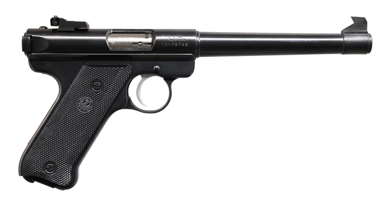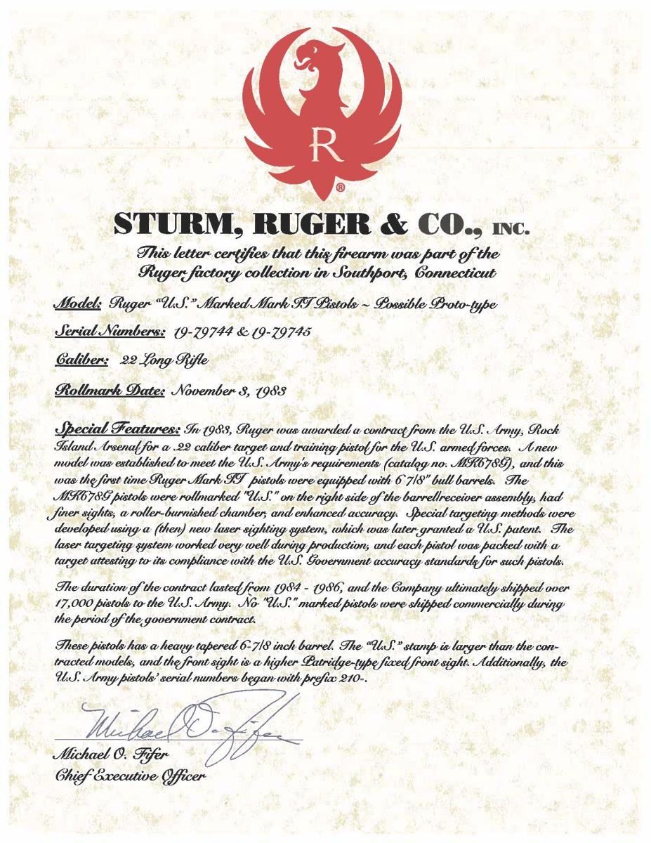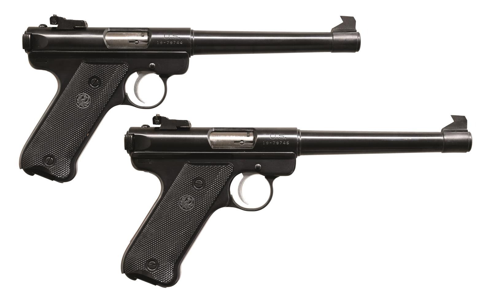 MK II TARGET SEMI-AUTO TARGET PISTOLS. BOTH: Cal. 22 LR. S# 19-79744, S# 19-79745. Bbls. 6 7/8" target with under cut square faced front sights and receiver mounted adjustable rears. "U.S." stamped above serial numbers. Mfg. 1984 (1982-2004) as MK-678 with blued finishes and checkered black plastic grips having single silver eagle medallion per pistol. Not marked "GOVERNMENT" yet have "G" on end of shipping sleeve that has new label listing Model as 00143. Consignor states prototype and believed to have been purchased as such through a Ruger benefit auction. Normal U.S. marked contract pistols started at S# 21000051 in July of 1984 per RENE Reference Guide. Extremely scarce pair of Rugers. MAGS: 2 TOTAL: 1 factory 10 rd. per pistol. UNATTACHED ACCESSORIES: yellow / black 1 piece box with packaging per pistol plus cardboard shipping sleeve as described with S# inked on label end. CONDITION: all aspects of both are near excellent appearing new and unfired. (23-6655, 23-6656/NW). BOTH MODERN. $1,500-2,250.