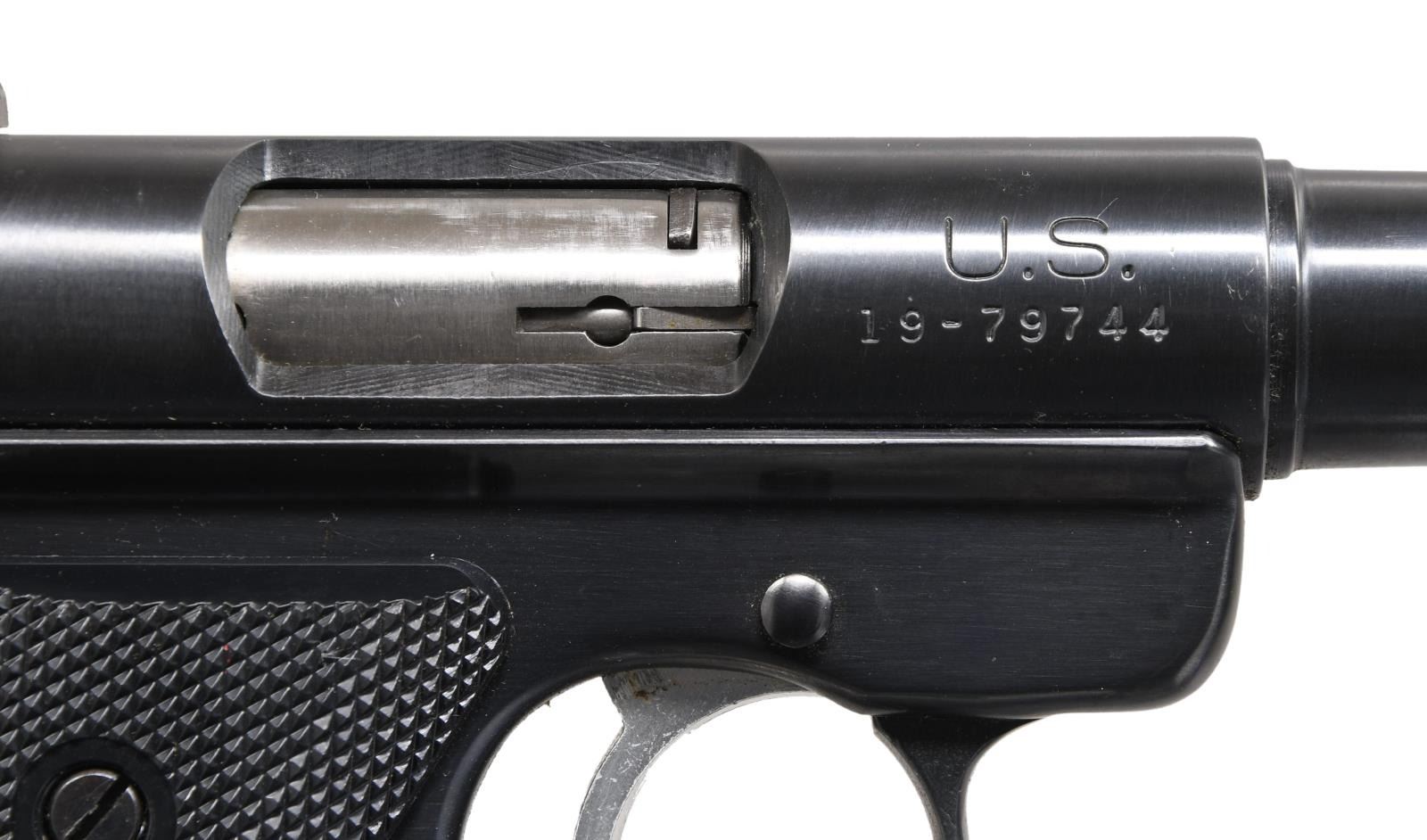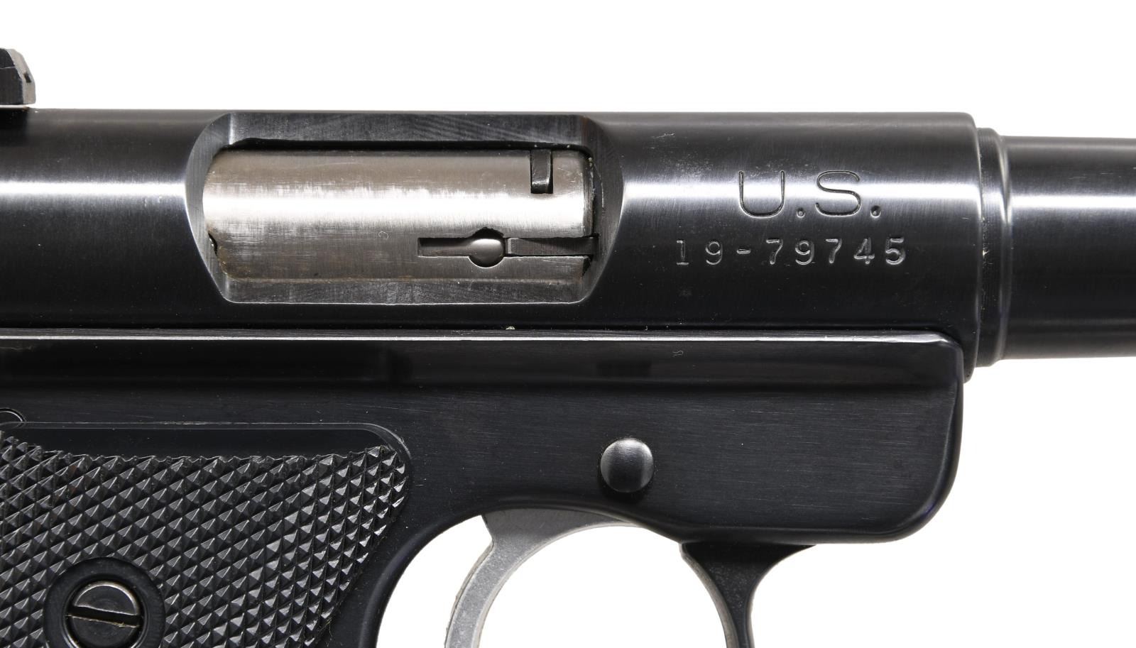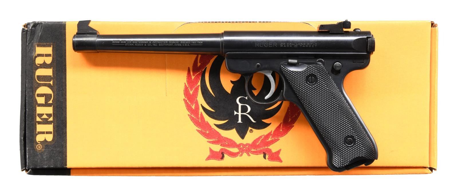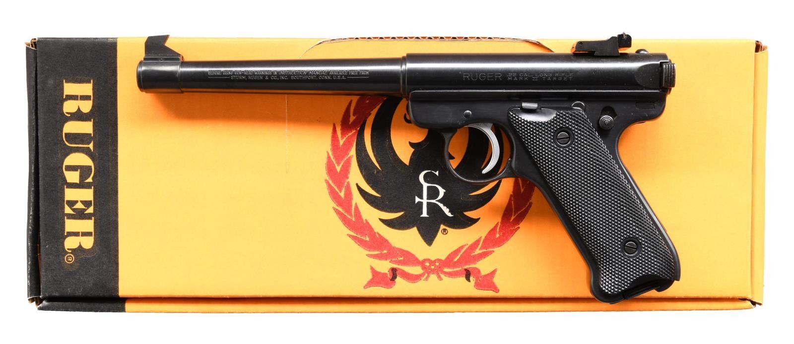 MK II TARGET SEMI-AUTO TARGET PISTOLS. BOTH: Cal. 22 LR. S# 19-79744, S# 19-79745. Bbls. 6 7/8" target with under cut square faced front sights and receiver mounted adjustable rears. "U.S." stamped above serial numbers. Mfg. 1984 (1982-2004) as MK-678 with blued finishes and checkered black plastic grips having single silver eagle medallion per pistol. Not marked "GOVERNMENT" yet have "G" on end of shipping sleeve that has new label listing Model as 00143. Consignor states prototype and believed to have been purchased as such through a Ruger benefit auction. Normal U.S. marked contract pistols started at S# 21000051 in July of 1984 per RENE Reference Guide. Extremely scarce pair of Rugers. MAGS: 2 TOTAL: 1 factory 10 rd. per pistol. UNATTACHED ACCESSORIES: yellow / black 1 piece box with packaging per pistol plus cardboard shipping sleeve as described with S# inked on label end. CONDITION: all aspects of both are near excellent appearing new and unfired. (23-6655, 23-6656/NW). BOTH MODERN. $1,500-2,250.