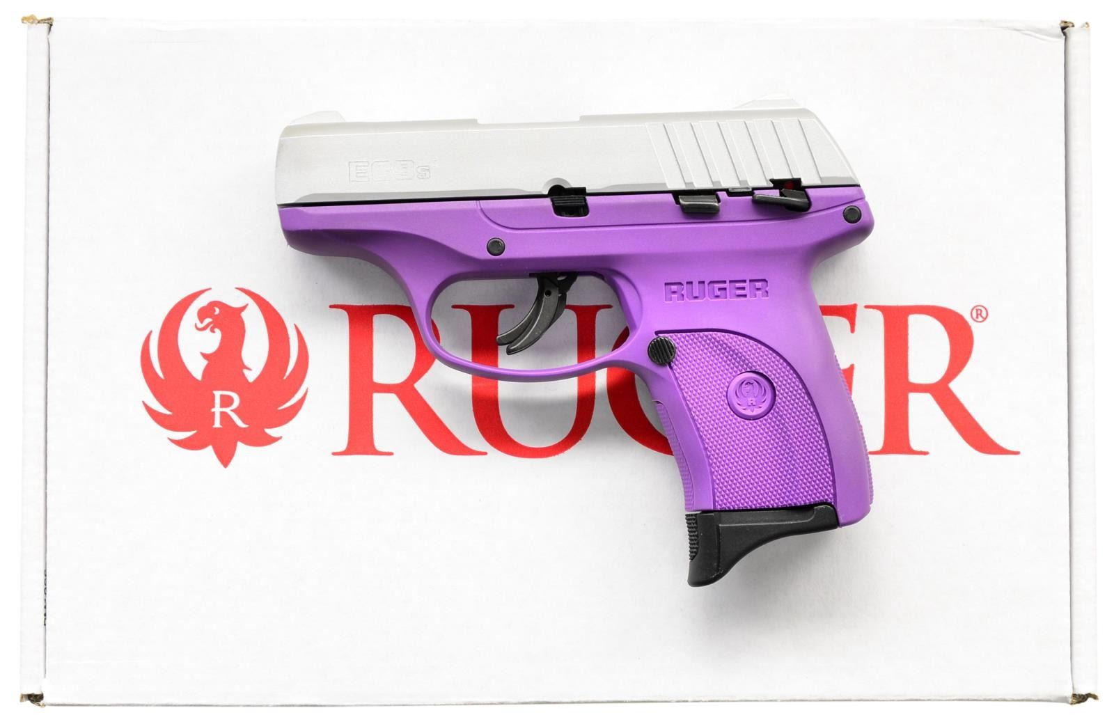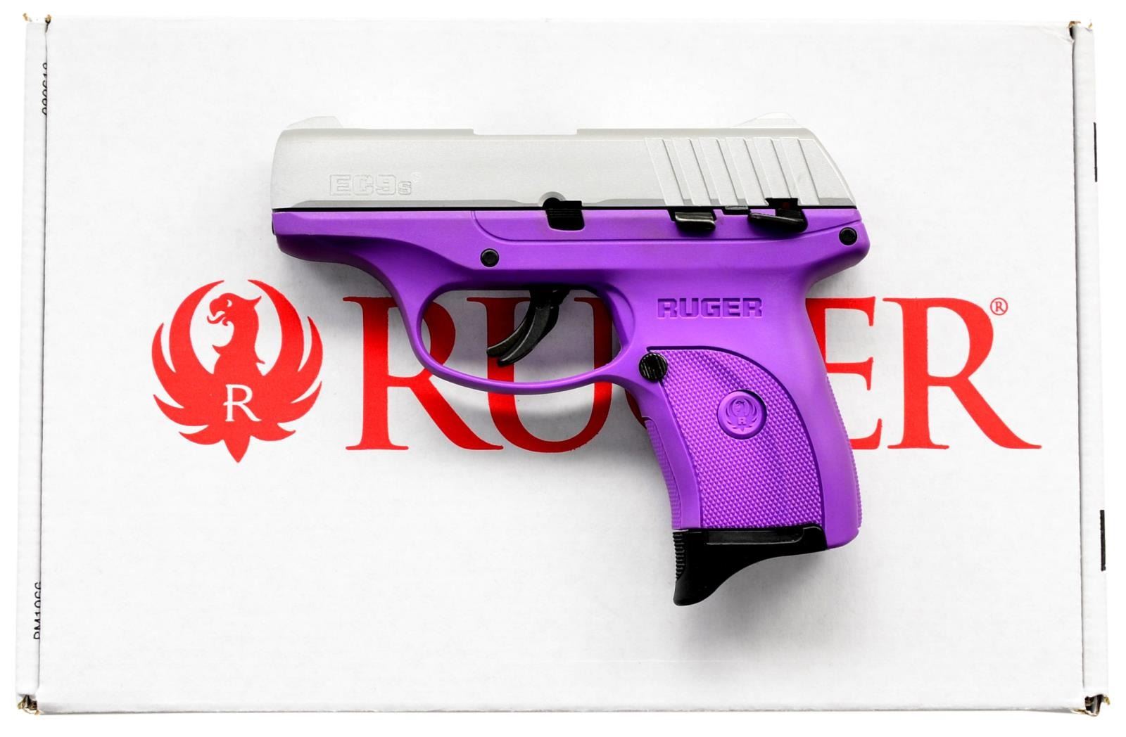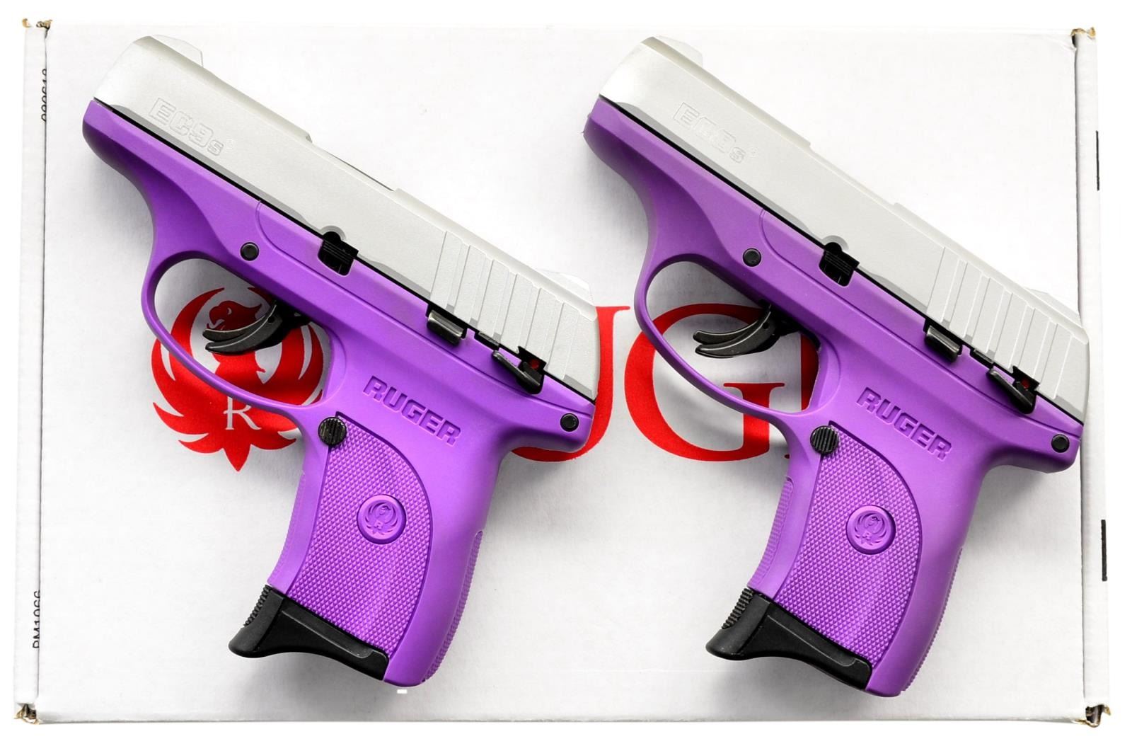 EC9s SEMI-AUTO PISTOLS. BOTH: Cal. 9mm Luger. S# 462-61127, S# 462-61128. Bbls. 3.12" with black oxide finishes. Mfg. 2023 (2018 to date) as Models 03295 with Purple polymer checkered frames and aluminum Cerakoted slides; integral sights having grooved faces to rear. Striker fired with multiple safeties: trigger blade, manual and magazine disconnect. MAGS: 2 TOTAL: 1 factory 7 rds. for each. UNATTACHED ACCESSORIES: matching numbered factory box with packaging for each. CONDITION: all aspects of both near excellent appearing new and unfired. (23-6124, 23-6125/NW). BOTH MODERN. $450-600.