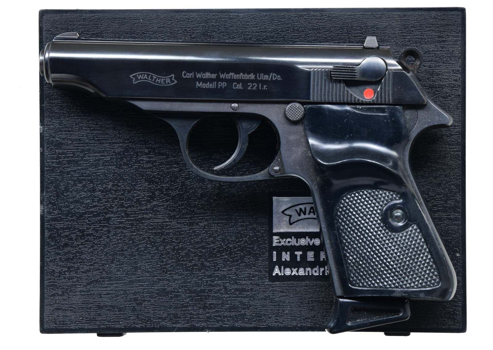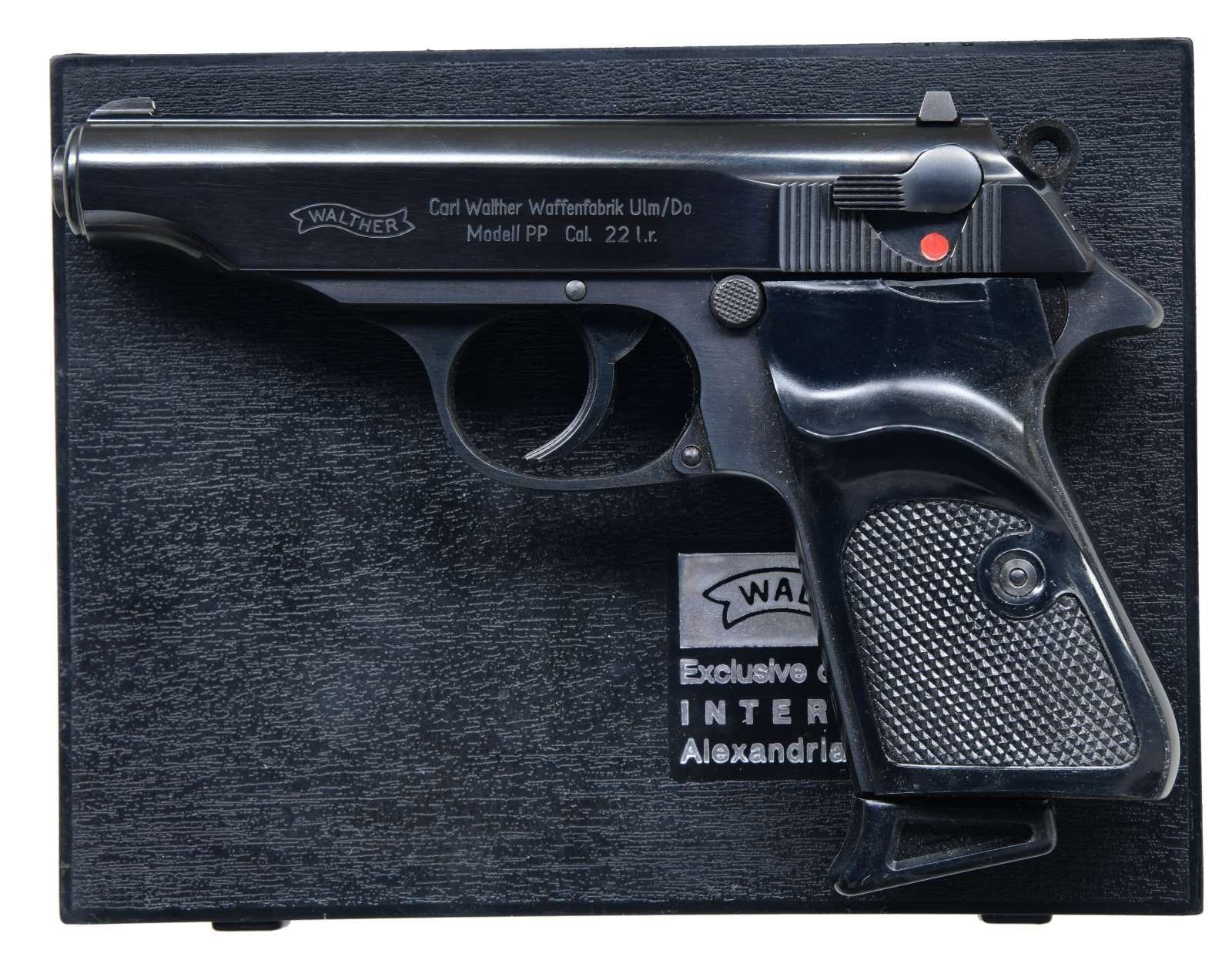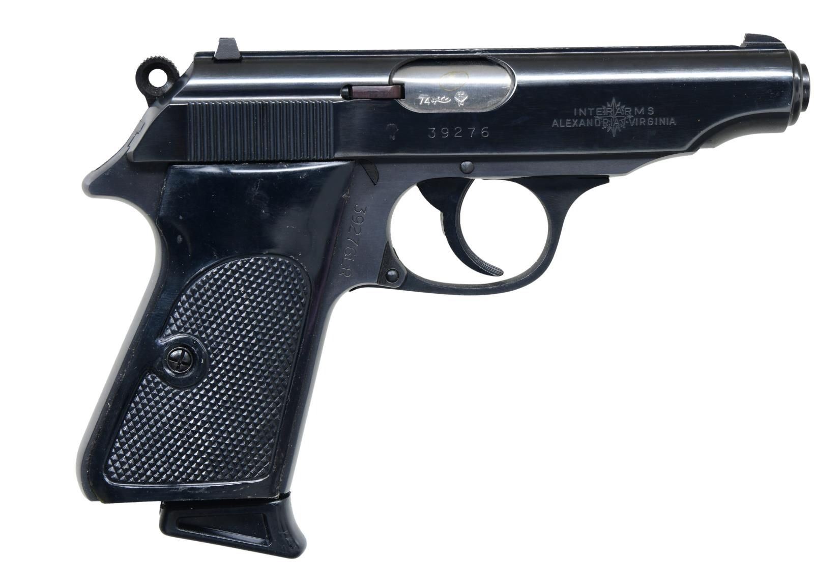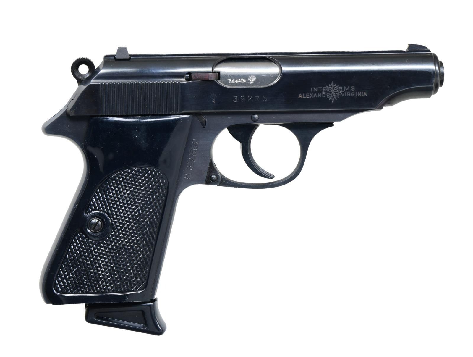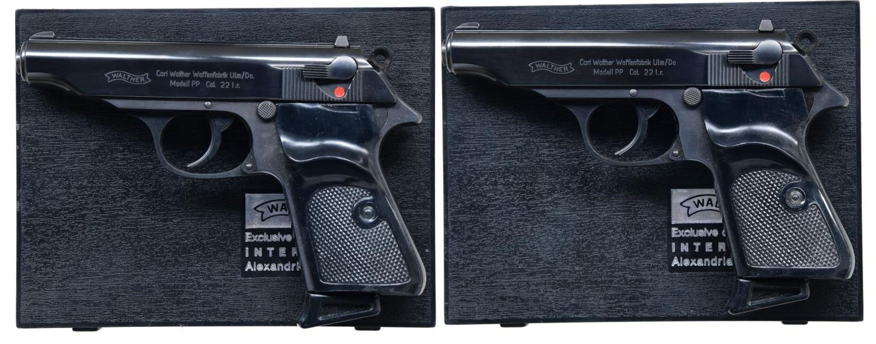 SEMI-AUTOMATIC PISTOLS WITH MATCHING FACTORY CASES & PAPER TEST TARGETS. 1) Cal. 22 LR. S# 39276LR. Bbl. 3 7/8". Model PP semi-automatic pistol mfg. by Walther and imported by Interarms in 1974. Left side of the slide is marked with the Walther banner logo, followed by markings stipulating Walther's mfg. information as well as the model and cal. designations. Right side of the slide is marked with an Eagle/N commercial nitro poof, followed by the S# and Interarms' importer information. Right side of the bbl. chamber is marked with the 2-digit year of mfg. "74". followed by an Ulm Proof House antler stamp and an Eagle/N nitro proof. Metal components exhibit a blue finish, with the frame being mounted with 2-piece checkered black plastic thumbrest grips. Mag. is fitted with a black plastic grip extension. MAGS: 2 10-rd. UNATTACHED ACCESSORIES: matching factory hard case containing factory paperwork, a matching factory paper test target, 1 spare mag., as well as a cleaning rod and brush. CONDITION: near new, with metal components retaining virtually all of their original factory blue finish overall. Brilliant mirror bore, exhibiting some grease and well-defined rifling throughout. Grips show a few superficial marks from handling and storage but otherwise remain sturdy and serviceable. Case body is missing its left lid "nipple", but otherwise is good overall. (23-3947/MLW). 2) Cal. 22 LR. S# 39275LR. Bbl. 3 7/8". Model PP semi-automatic pistol mfg. by Walther and imported by Interarms in 1974. Left side of the slide is marked with the Walther banner logo, followed by markings stipulating Walther's mfg. information as well as the model and cal. designations. Right side of the slide is marked with an Eagle/N commercial nitro poof, followed by the S# and Interarms' importer information. Right side of the bbl. chamber is marked with the 2-digit year of mfg. "74". followed by an Ulm Proof House antler stamp and an Eagle/N nitro proof. Metal components exhibit a blue finish, with the frame being mounted with 2-piece checkered black plastic thumbrest grips. Mag. is fitted with a black plastic grip extension. MAGS: 2 10-rd. UNATTACHED ACCESSORIES: matching factory hard case containing factory paperwork, a matching factory paper test target, 1 spare mag., as well as a cleaning rod and brush. CONDITION: near new, with metal components retaining virtually all of their original factory blue finish overall. Brilliant mirror bore, exhibiting some grease and well-defined rifling throughout. Grips show a few superficial marks from handling and storage but otherwise remain sturdy and serviceable. Case is very good overall. PROVENANCE: the collection of Gun Sport Ltd., owned by Jon R. Thomas. (23-3948/MLW). BOTH CURIO. $2,000-2,750.