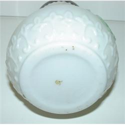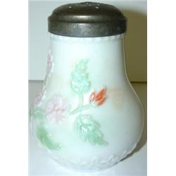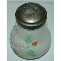 CONSOLIDATED GLASS FLORAL DECORATED SUGAR SHAKER. Has silver plate lid and pink floral and relief decoration around body. 4.5" H
