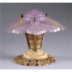 Lot 837 CONSOLIDATED GLASS LAMP Rare Consolidated glass Martele Modernizer ceiling fixture. Soft amethyst color accented by pink, yellow, and blue flowers. Complete with original painted matching ceiling hardware. Unsigned. SIZE: 8-1/2” t x 10” w. CONDITION: Minor chips. 5-70736