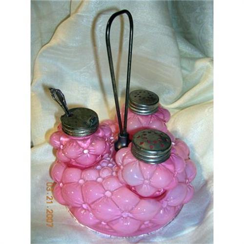 Consolidated Glass "Bulging Cone" Pink Condiment Set. Exquisite pink glass condiment set with sterling stand. Excellent condition. Includes salt, pepper, and mustard or mayonnaise jar with 3-inch sterling serving spoon.