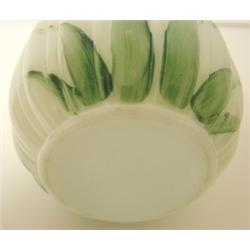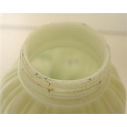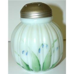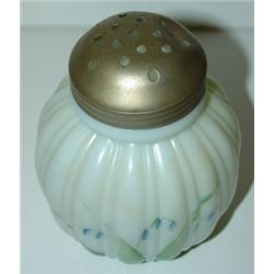 CONSOLIDATED GLASS WHITE SUGAR SHAKER with ribbed body. Has blue & green hand painted decoration around body. Shaker shows roughness around top of rim. Lid is silverplate. 4.5" H
