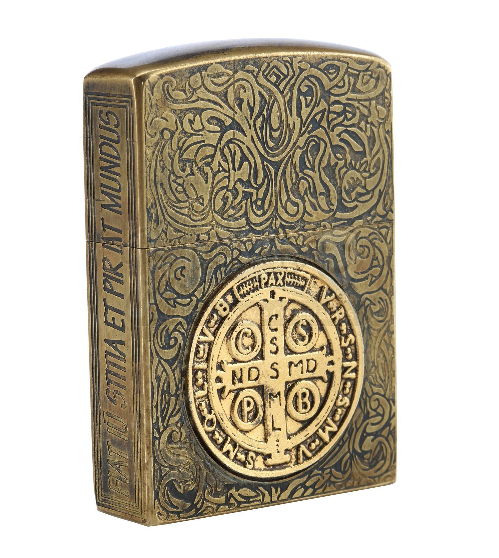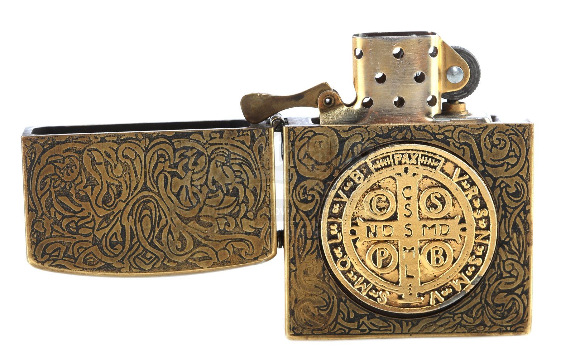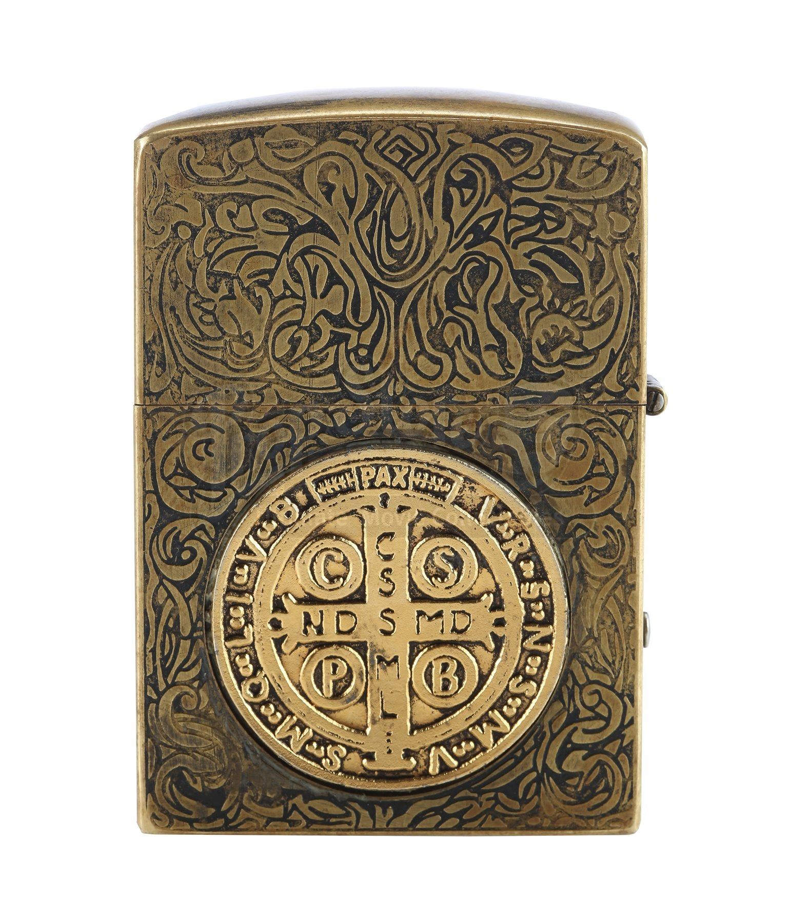 Made from a real lighter encased in brass and detailed with swirling engravings, the lighter features the St. Benedict medal inlaid on each side. Additionally, the Latin phrase “fiat iustitia, et pereat mundus” is engraved into one side of the lighter. This translates as “Let justice be done, and let the world perish”.