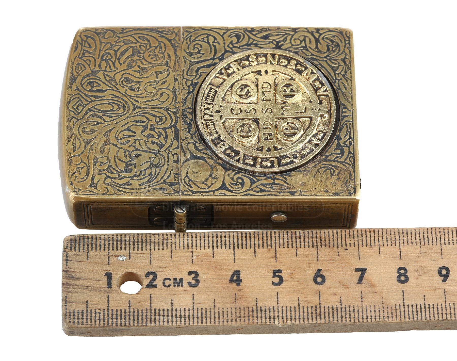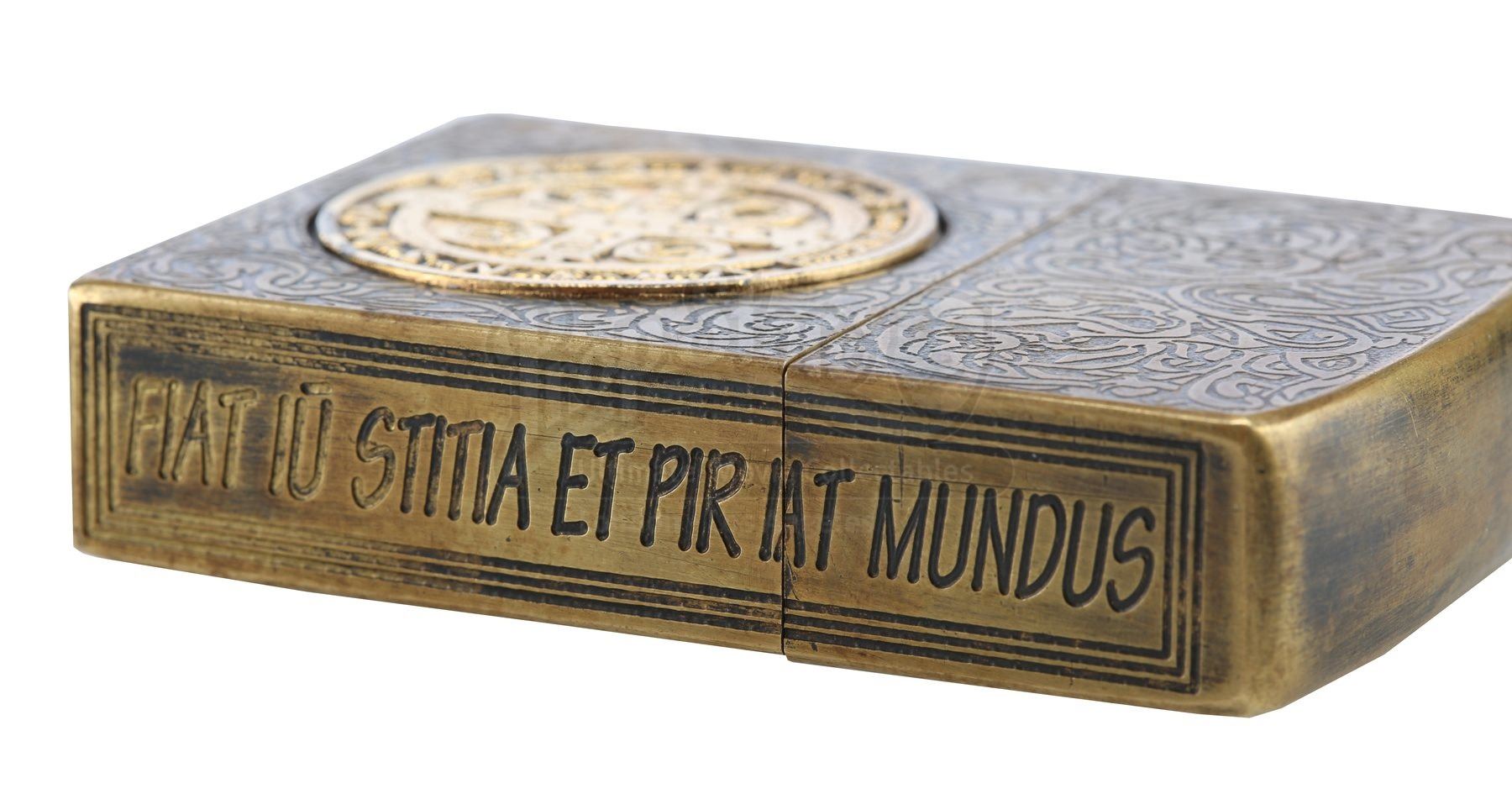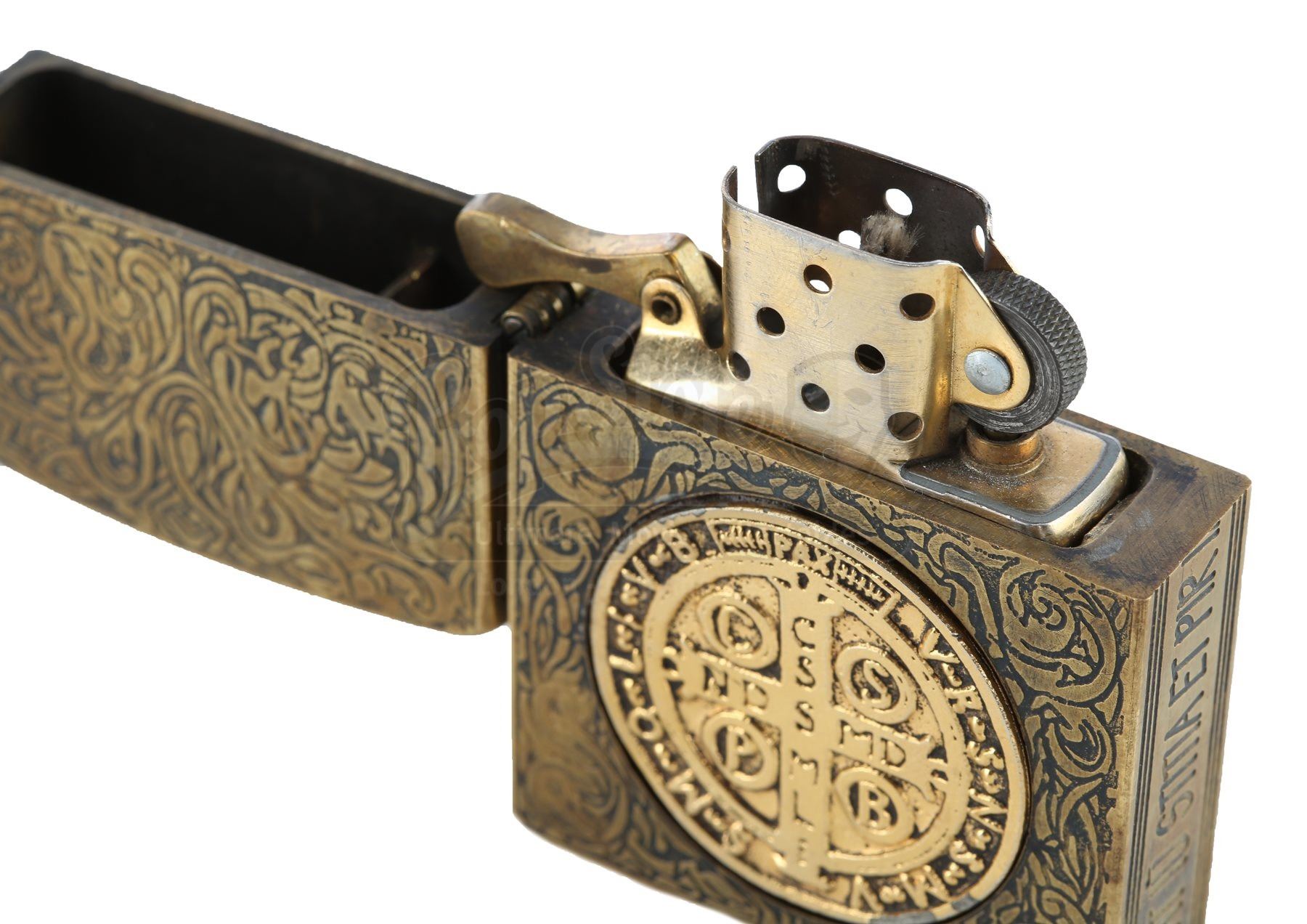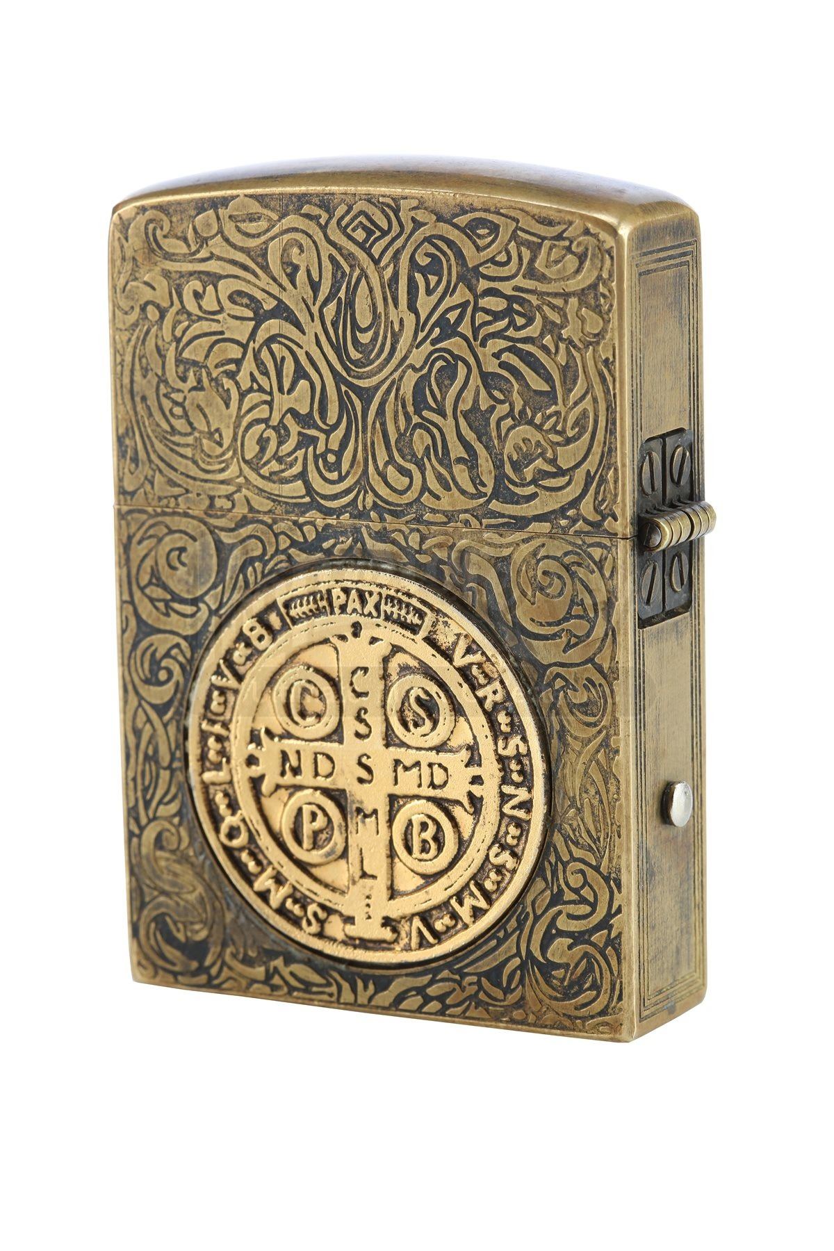Made from a real lighter encased in brass and detailed with swirling engravings, the lighter features the St. Benedict medal inlaid on each side. Additionally, the Latin phrase “fiat iustitia, et pereat mundus” is engraved into one side of the lighter. This translates as “Let justice be done, and let the world perish”.