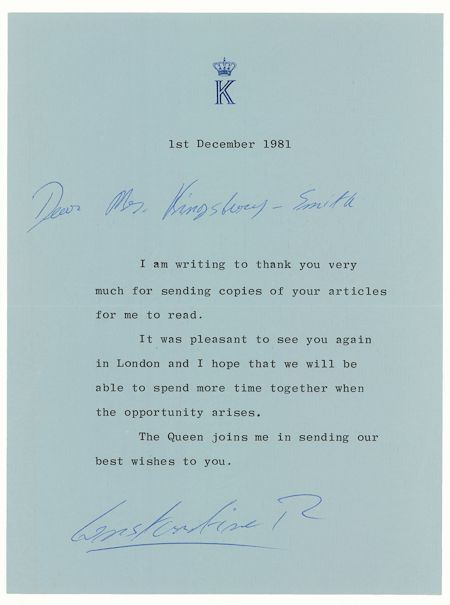 (b. 1940) Last monarch of Greece. T.L.S. 1p. 8vo., on official letterhead marked with his initial "K" at top, Dec. 1, 1981 to Mr. Kingsbury-Smith, thanking her for copies of her articles, and adding: "The Queen joins me in sending our best wishes to you". With holograph greeting, fine.