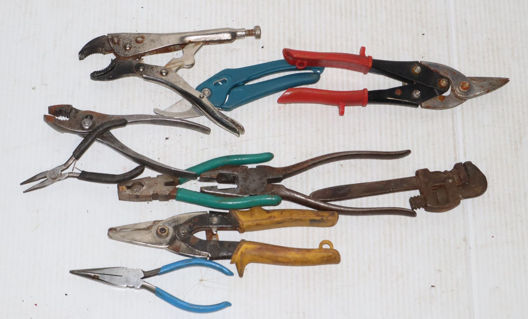 CONTAINER OF TIN SNIPS, PLIERS, AND MORE