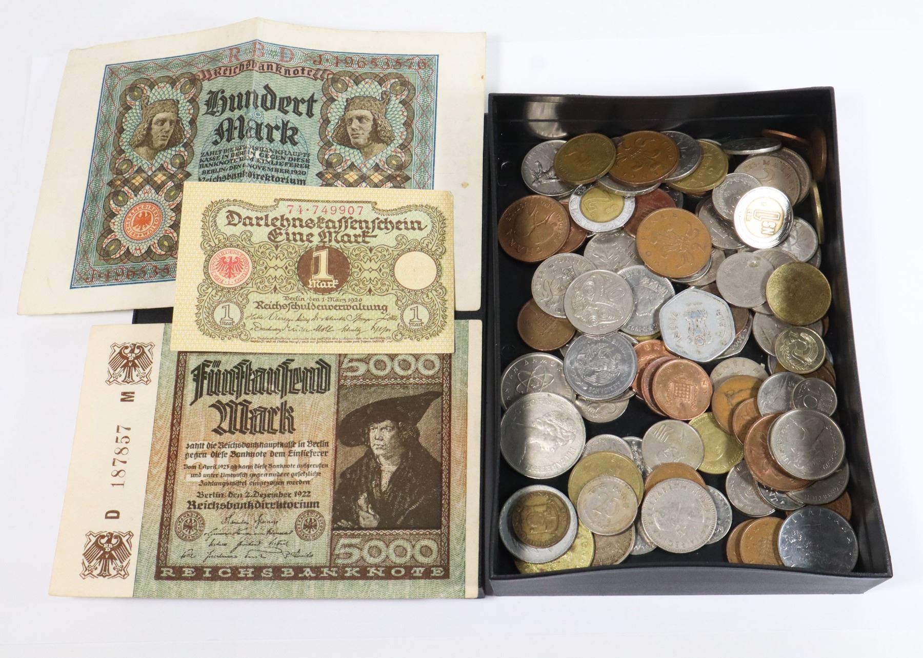 CONTAINER OF VARIOUS WORLD COINS AND BANKNOTES