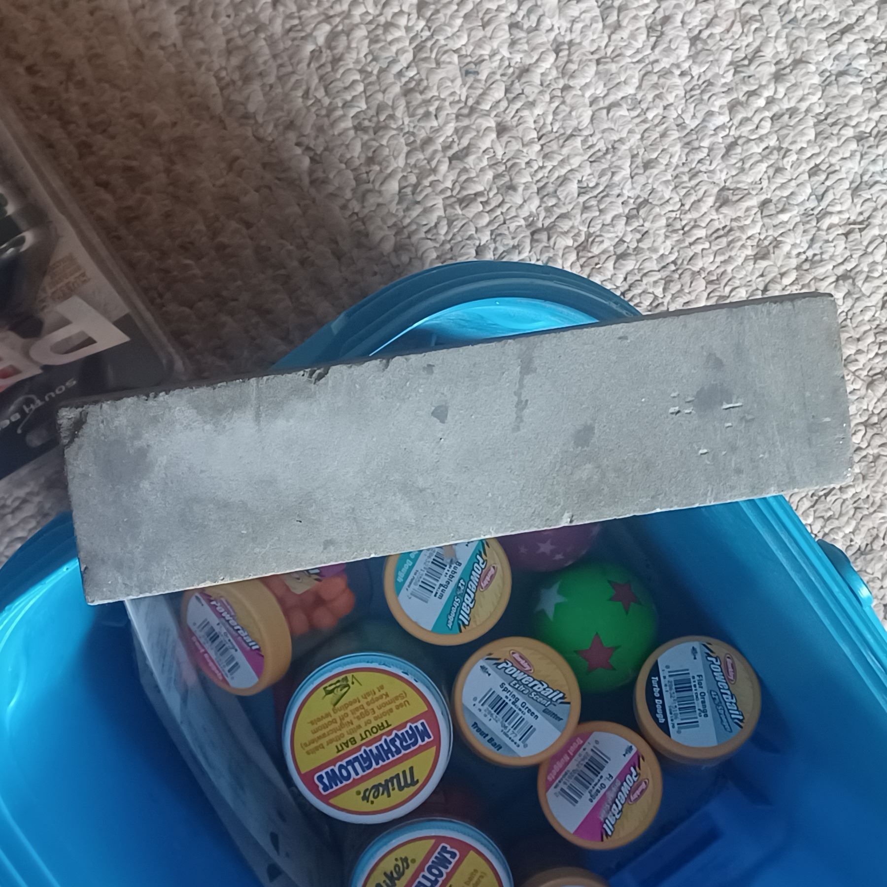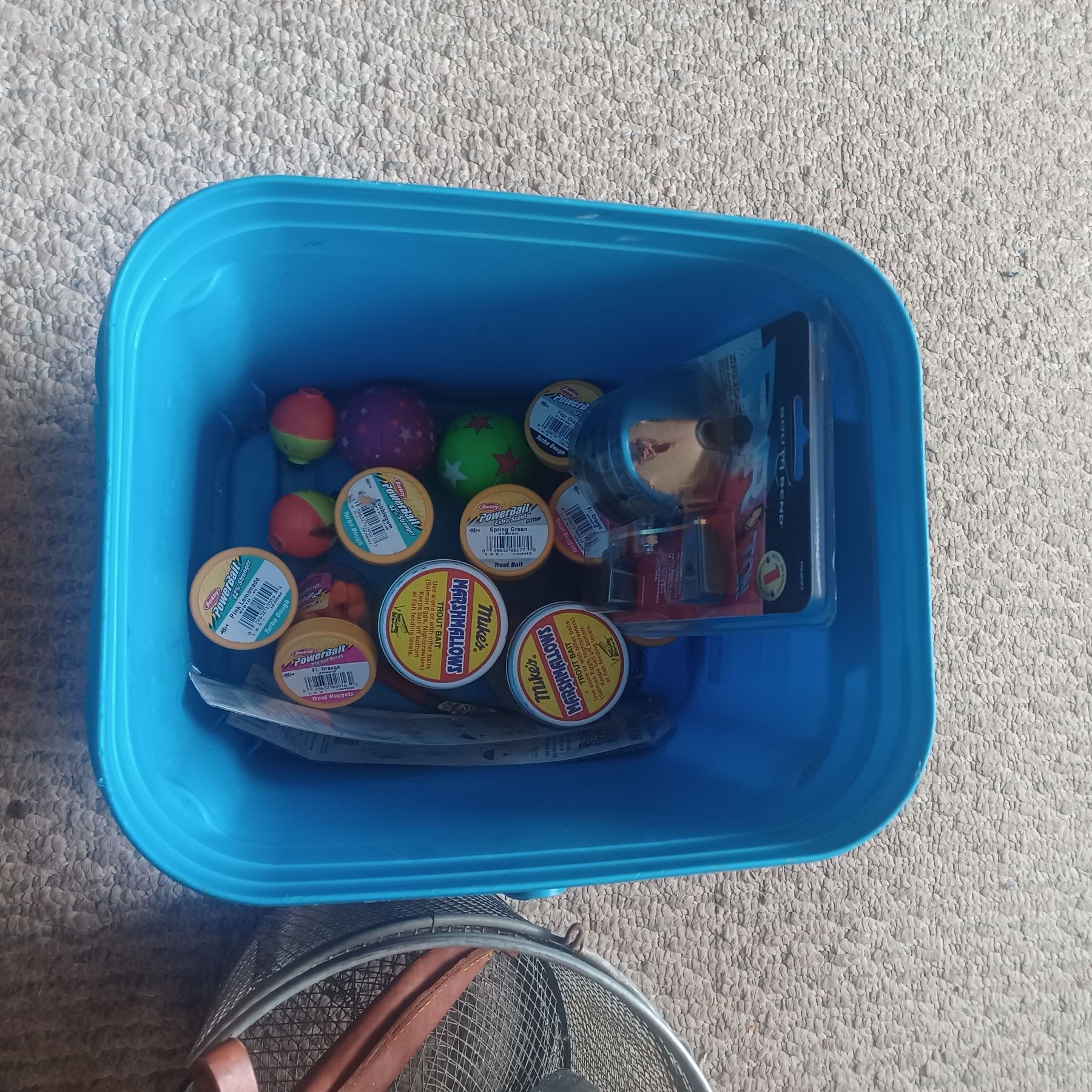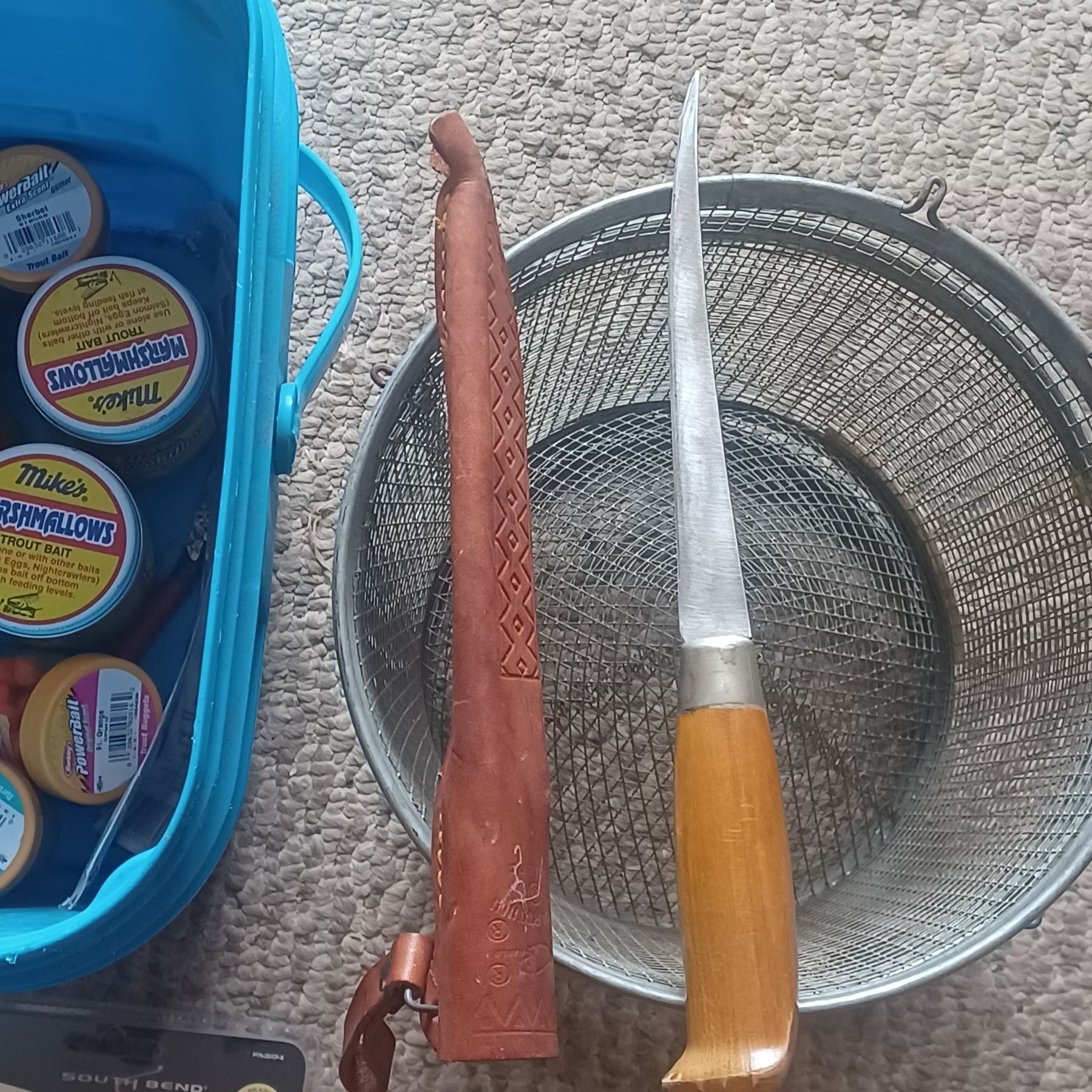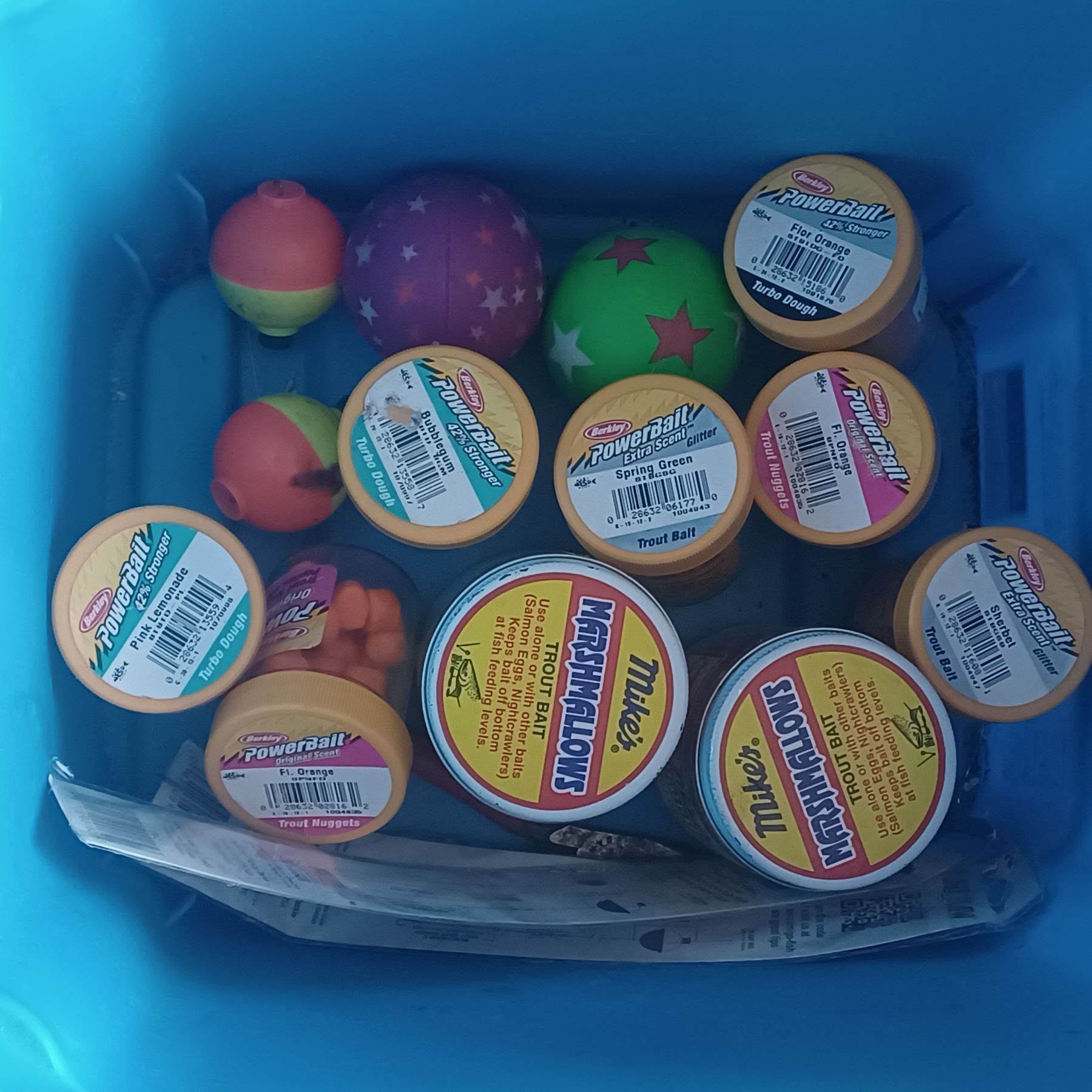 CONTAINER WITH BAIT, MINNO TRAP, RAPALA KNIFE AND STONE PLUS NEW SOUTH BEND REEL