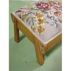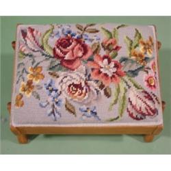 CONTEMPORARY INCLINED NEEDLEPOINT FOOTSTOOL. Floral decorated needlepoint top. 14" H, 21" W, 15" D