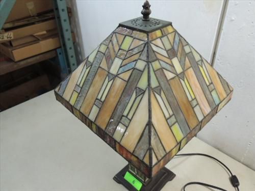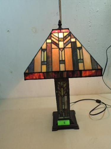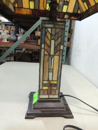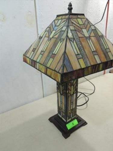 CONTEMPORARY ART & CRAFT STYLE SLAG GLASS & LEAD LAMP. BOTH BASE & SHADE ARE STAIN GLASS STYLE. 22"H. AS SHOWN. VIEW PICTURE FOR DETAIL.