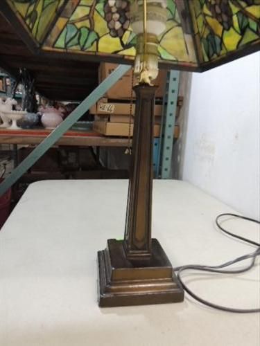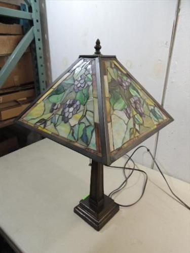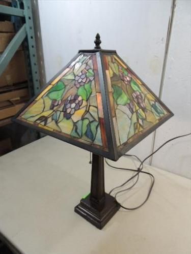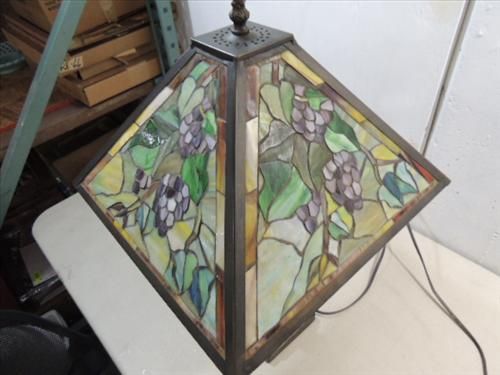 CONTEMPORARY ART & CRAFT STYLE SLAG GLASS & LEAD LAMP. SHADE IS STAIN GLASS STYLE. BASE IS DIE CAST METAL. 24"H. AS SHOWN. VIEW PICTURE FOR DETAIL.