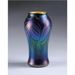 Lot 300 CONTEMPORARY ART GLASS VASE Very striking art glass vase has blue and green pulled feather design with iridescent highlights showing purple, blue and green. The vase is cased with a bright yellow interior. Signed on bottom “Vandermark 0452 1978”. SIZE: 8-1/2” t. CONDITION: Very good to excellent. 5-70266
