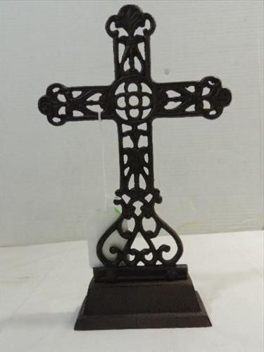 CONTEMPORARY CAST IRON STYLIZED CROSS ON BASE. 12"H. AS SHOWN. VIEW PICTURE FOR DETAIL.