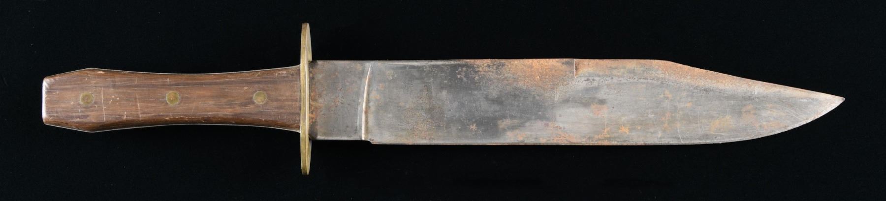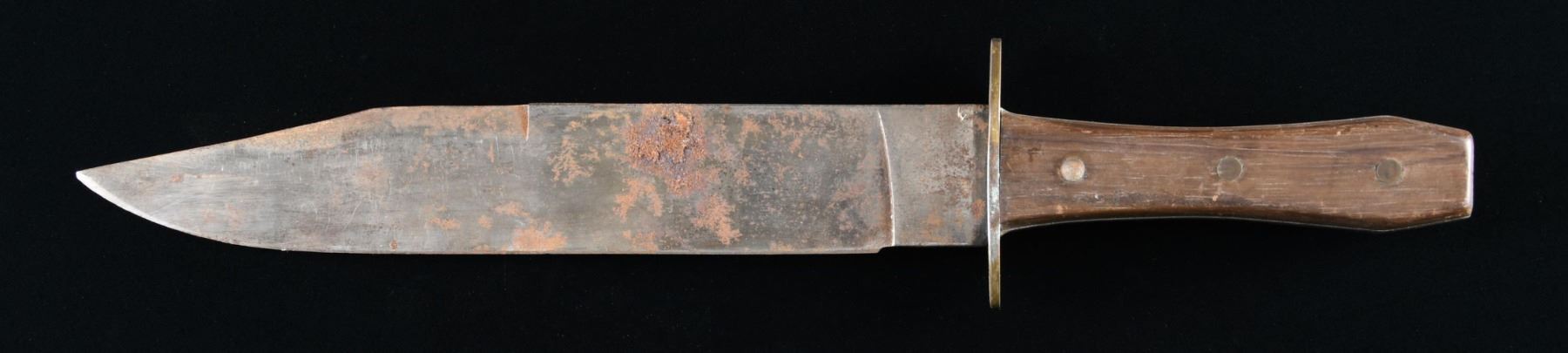 15.5" overall, 10.5" clip point, full tang, well fit wood slab grips retained by 3 large pins. CONDITION: very good overall, old sharpening, staining and scattered rust. (02-23981/JS). NON-GUN. $200-300.