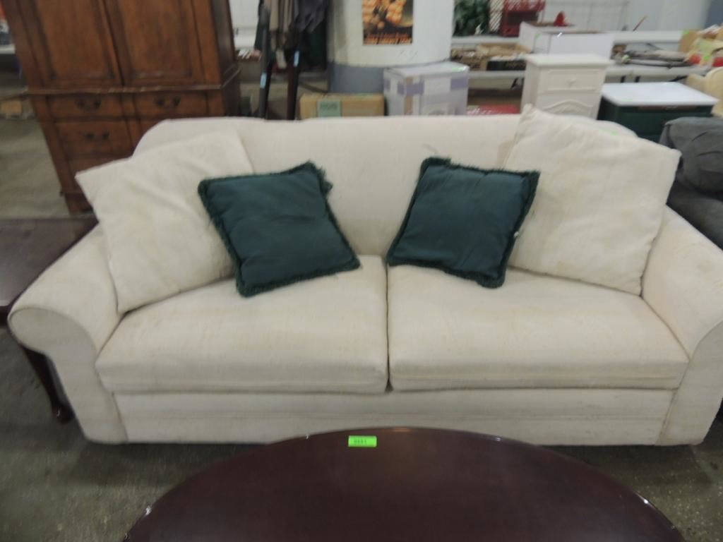 DECORATIVE SOFA WITH THROW PILLOWS, VINTAGE SOFA, CREAM COLOR FABRIC SOFA AS SHOWN SEE PHOTO FOR MORE DETAILS.