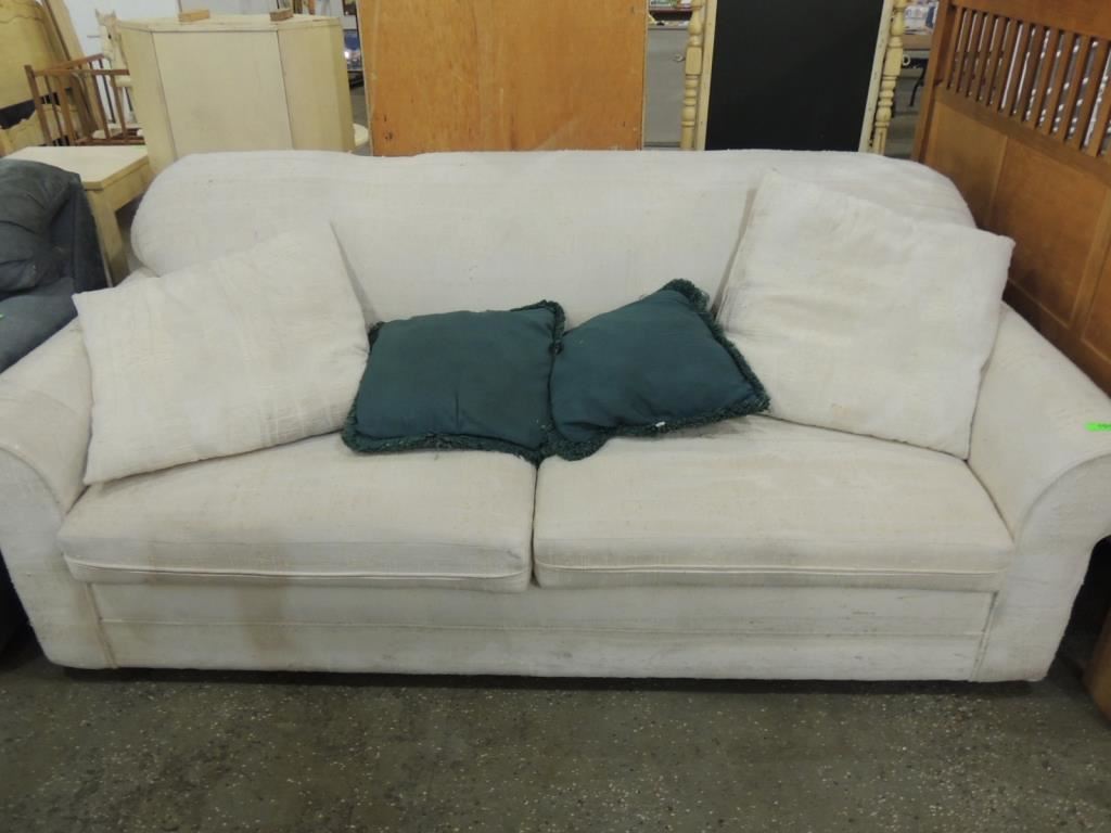 DECORATIVE SOFA WITH THROW PILLOWS, VINTAGE SOFA, CREAM COLOR FABRIC SOFA AS SHOWN SEE PHOTO FOR MORE DETAILS.