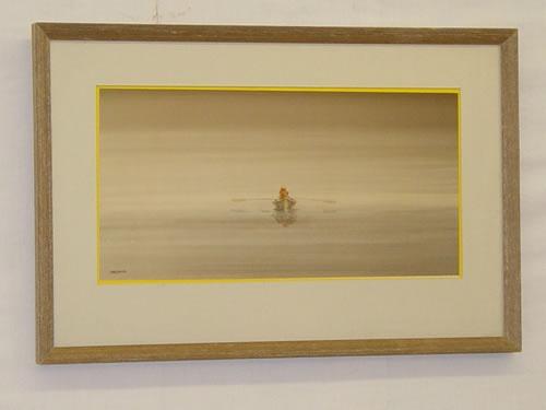 CONTEMPORARY GICLEE PRINT SIGNED DONN DEVITA (CAPE COD ARTIST) OF MAN IN A ROWBOAT-MATTED & FRAMED W/ BROCHURE ON BACK (8 1/2" X 17 1/4")