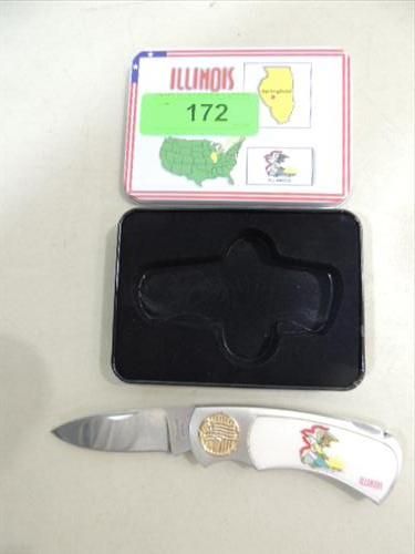 CONTEMPORARY ILLINOIS STAINLESS STEEL POCKET KNIFE & TIN. AS SHOWN. VIEW PICTURE FOR DETAIL.