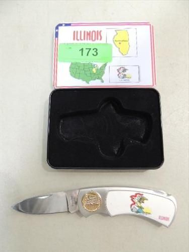 CONTEMPORARY ILLINOIS STAINLESS STEEL POCKET KNIFE & TIN. AS SHOWN. VIEW PICTURE FOR DETAIL.