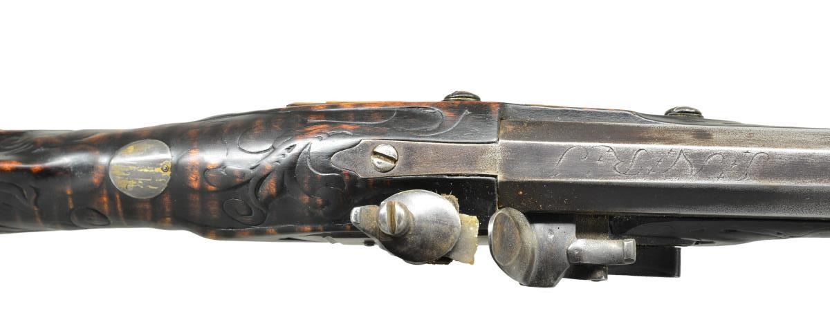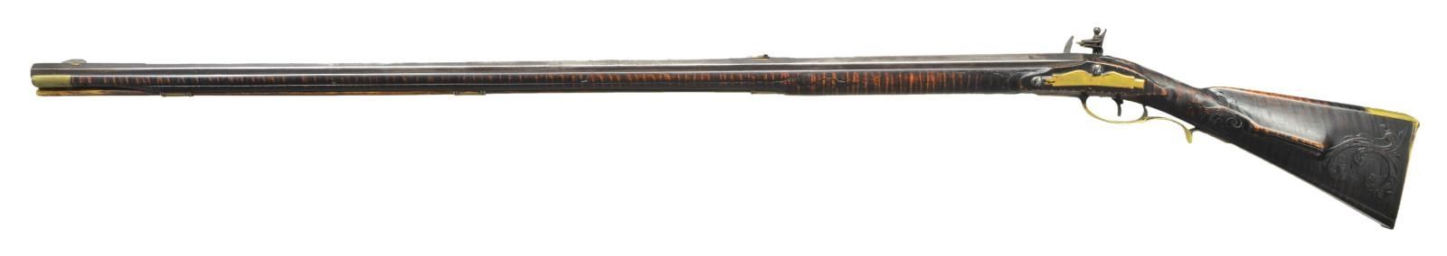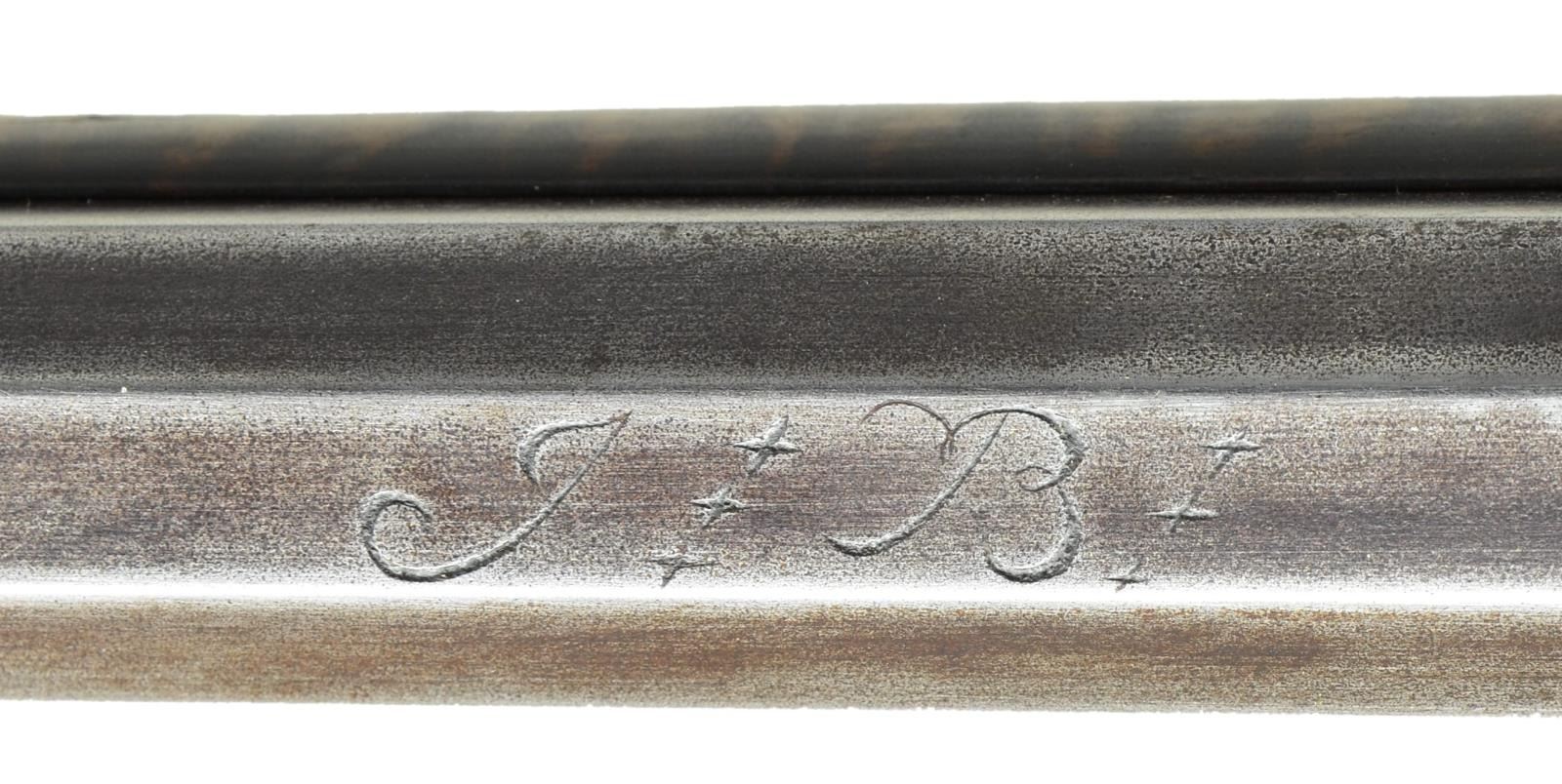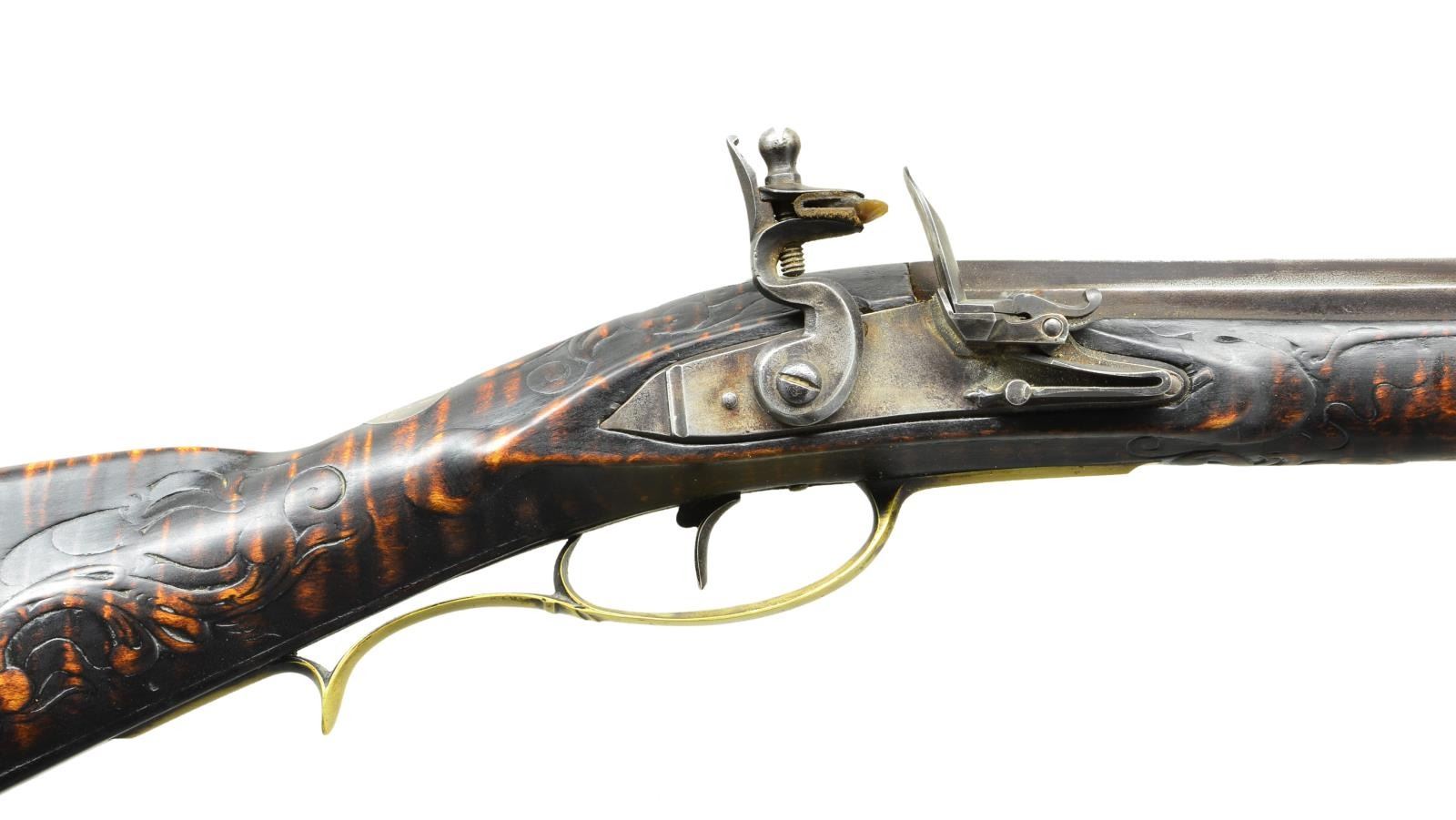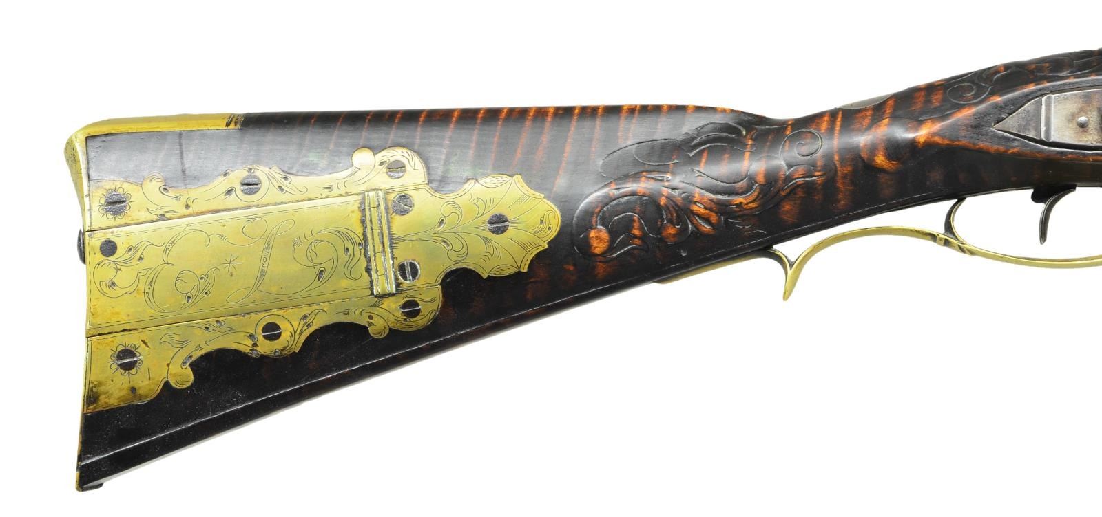 Cal. 50. NSN. Bbl. 42" full oct. rifled signed "J.B. & INRI." Hand forged lock is unmarked. Curly maple stock is relief carved forward & rear of cheek piece, around bbl. tang, forward of trigger guard & forward of patch box. 4 Piece patch box is engraved. 4-3/4" Beveled brass sideplate is not engraved. "INRI" marking on the bbl. stands for Jesus of Nazareth, King of the Jews, referring to the sign on the cross when he was crucified. Jud Brennan is considered among the best of contemporary makers, & this is an excellent example of his work. Signed inside patchbox in fancy script “J*Brennan 1985”. CONDITION: patch box needs adjustment. PROVENANCE: Estate of Frank Glenn Marsh. (01-21315/RG). ANTIQUE. $2,000-3,500.