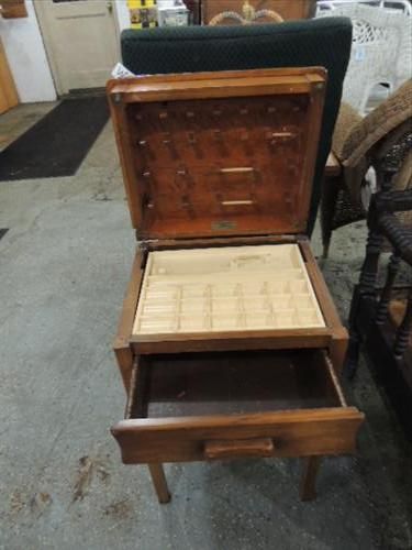 CONTEMPORARY MAPLE SEWING SUPPLY CABINET. 17X13X26. AS SHOWN. VIEW PICTURE FOR DETAIL.
