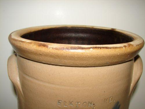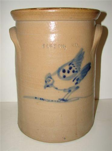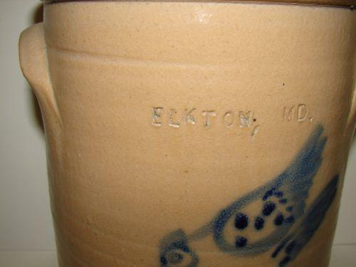 CONTEMPORARY MARYLAND STONEWARE CROCK. Eared handles. Cobalt blue bird decoration on body. Stamped above decoration "Elkton, MD." 11" H