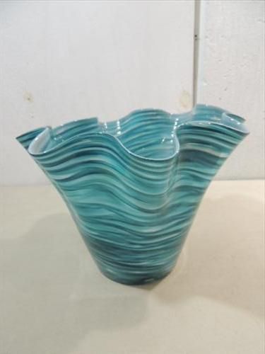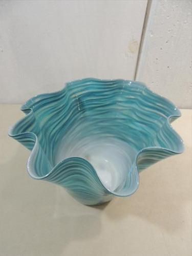 CONTEMPORARY MODERN ART BLUE & WHITE GLASS RUFFLED EDGE VASE. 12"D. AS SHOWN. VIEW PICTURE FOR DETAIL.