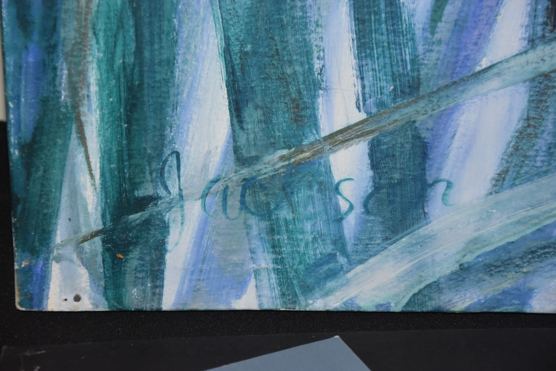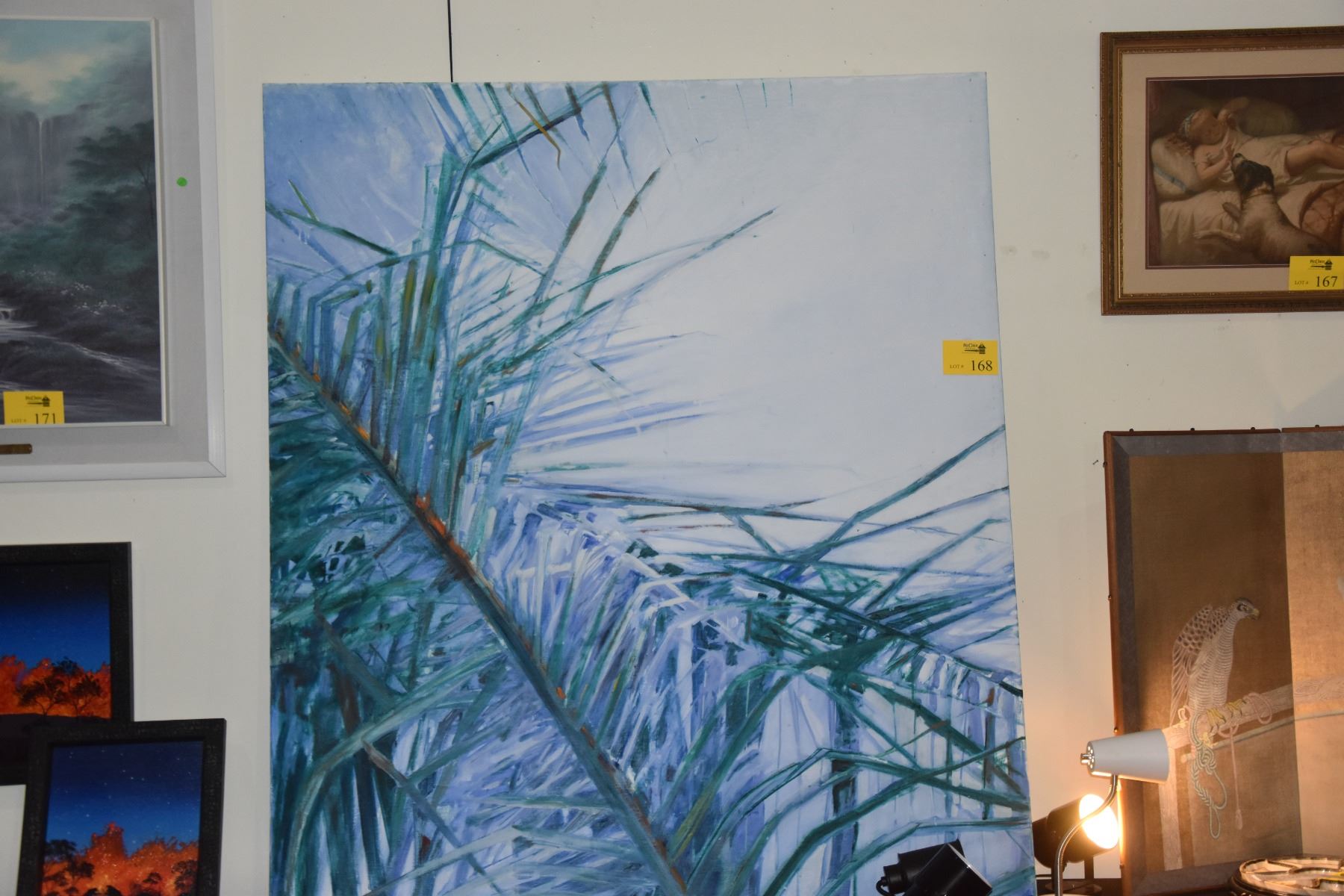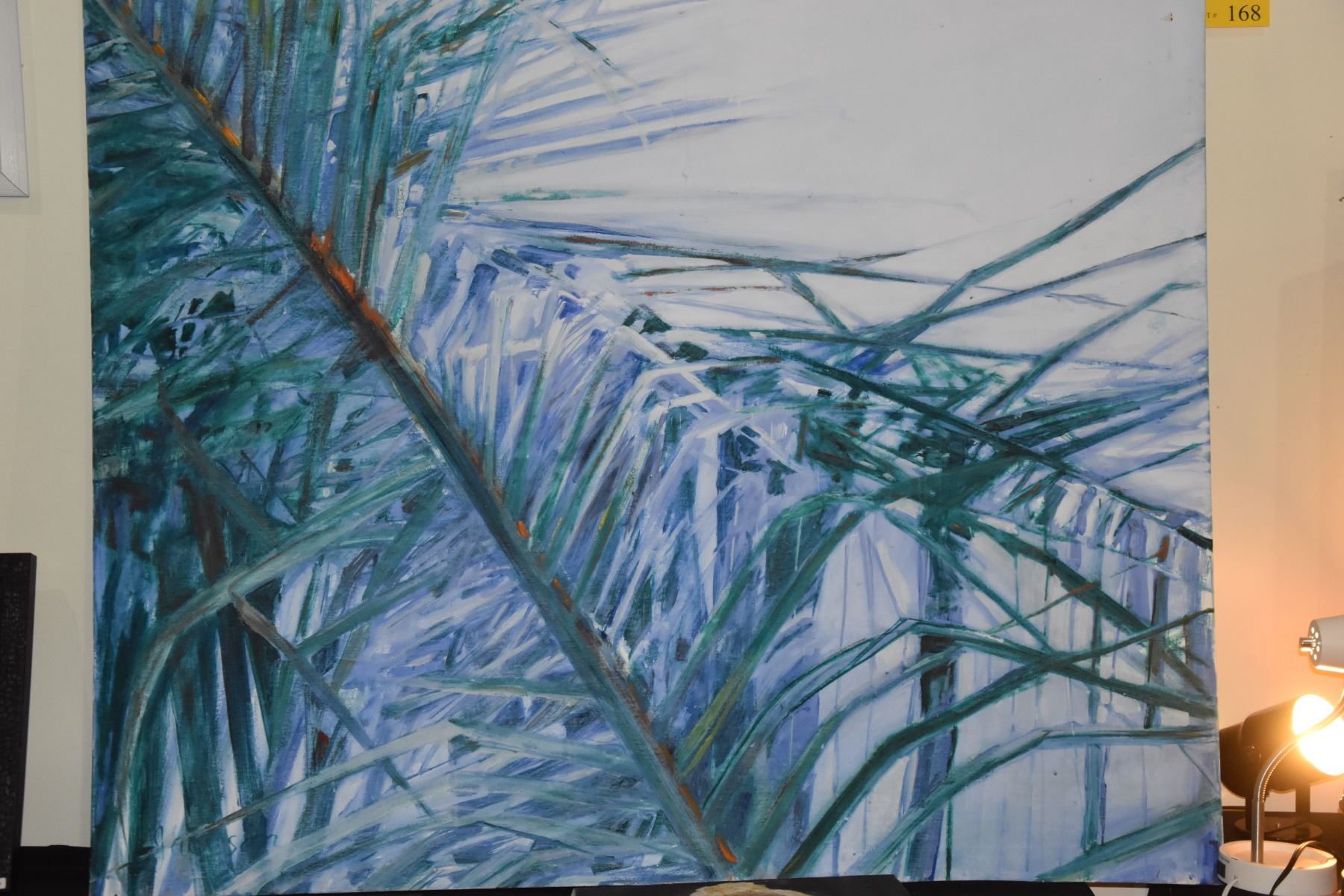 CONTEMPORARY OIL ON CANVAS BY BARBARA JACKSON, UNKNOWN TITLE, DEPICTING THE FRONDS OF COCONUT TREES; SIGNED JACKSON, UNFRAMED (64" X 55")