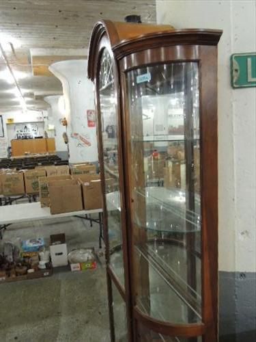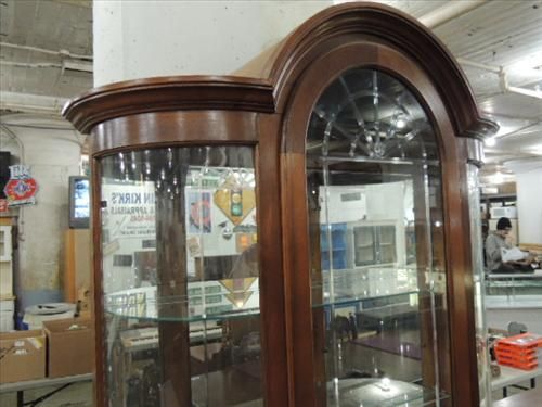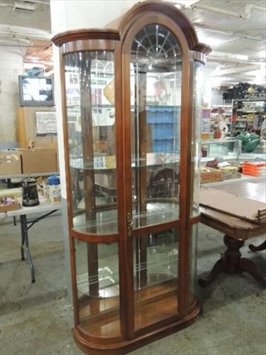 CONTEMPORARY WALNUT POLASKI FURNITURE DISPLAY CABINET: CURVED GLASS FRONT, 4 GLASS SELVES, LIGHTED, MIRRORED BACK, ARCH TOP. 39X12X84. AS SHOWN. VIEW PICTURE FOR DETAIL.
