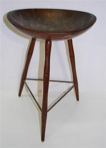 CONTEMPORARY PRIMITIVE DOUGH BOWL STAND WITH THREE TURNED LEGS. 16” H.