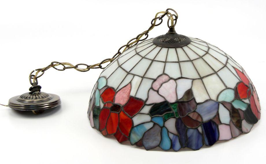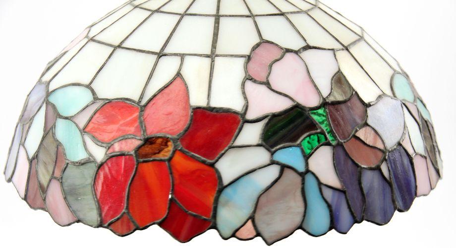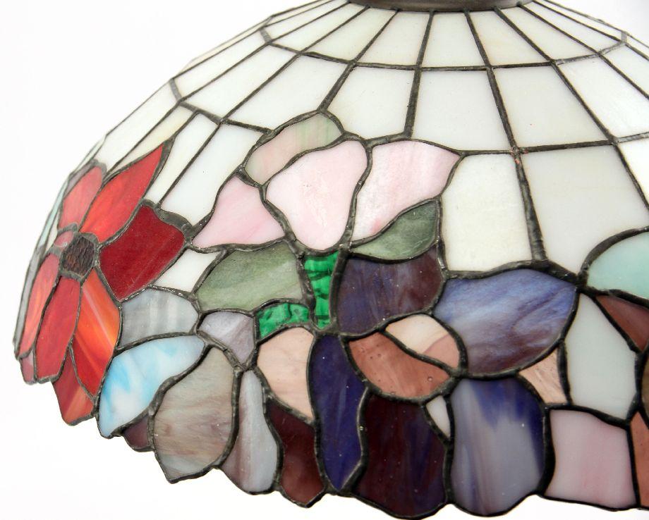 11 inches in height with 16.5 inch diameter. Tiffany style stained glass lamp with floral motif in red, purple, and ivory. Good condition with some small cracks noted.