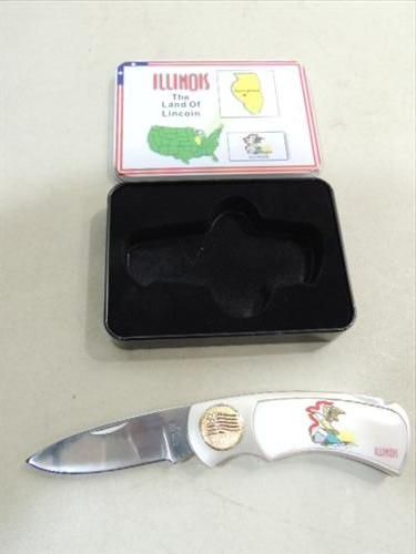 CONTEMPORARY STAINLESS STEEL 7" ILLINOIS FOLDING KNIFE IN METAL TIN. AS SHOWN. VIEW PICTURE FOR DETAIL.