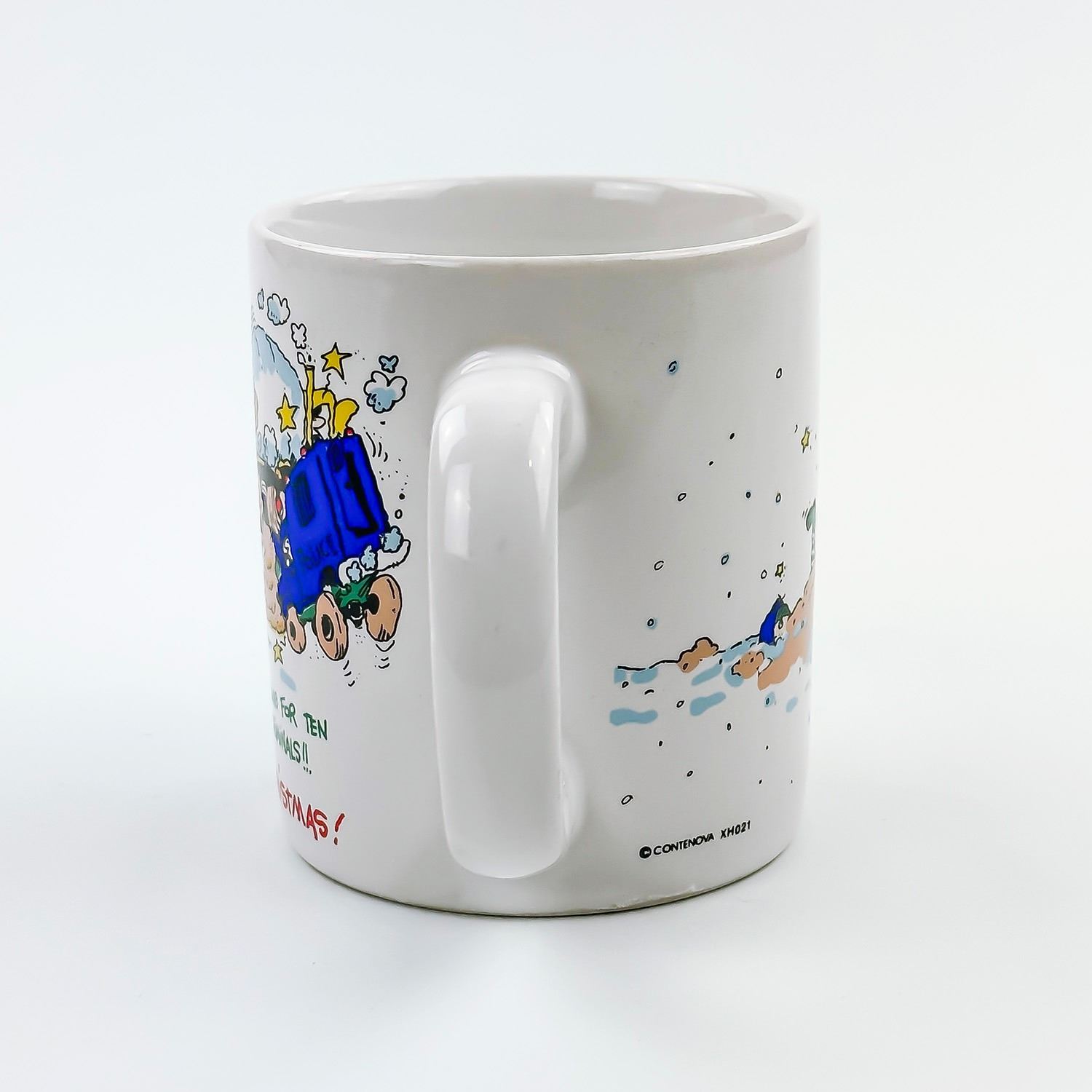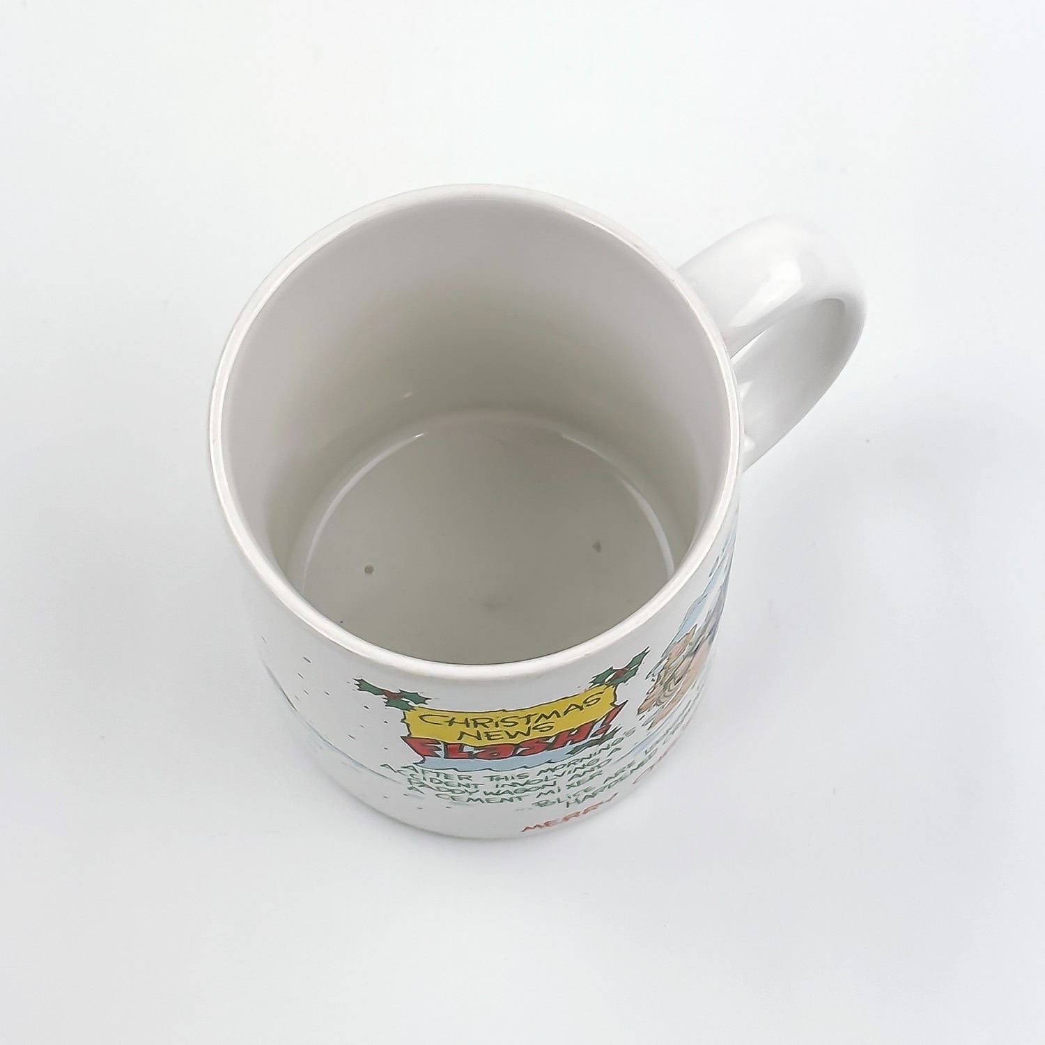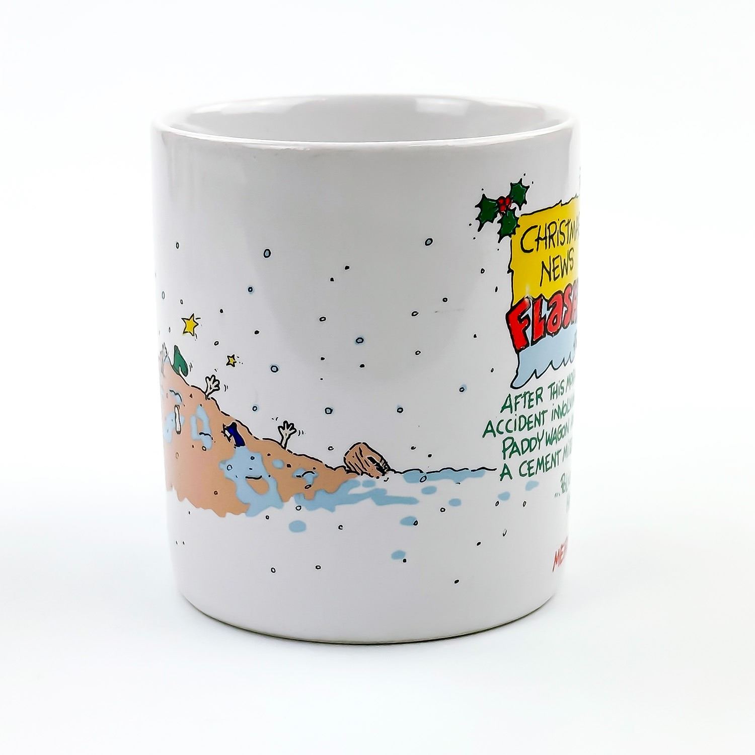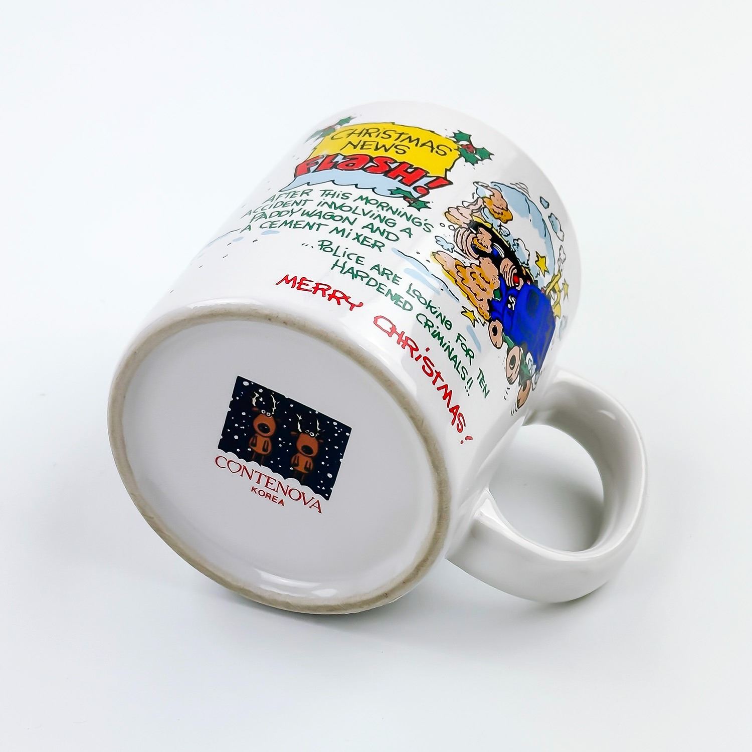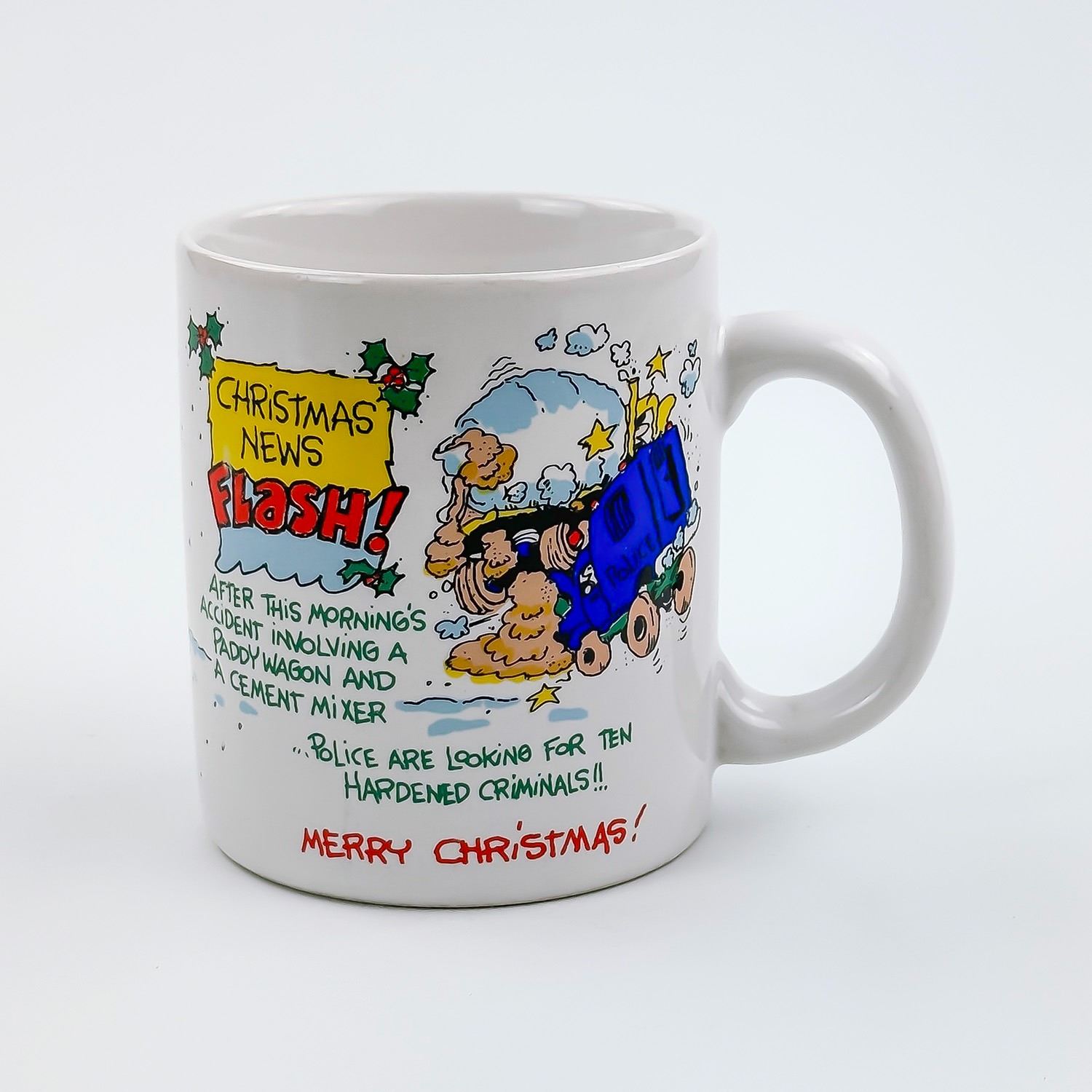 #8160 - CHRISTMAS NEWS FLASH - HARDENED CRIMINALS HUMOROUS CERAMIC COFFEE MUG CUP. MEASURES: 4.5” (11.5 CM) WIDE INCLUDING HANDLE AND STANDS 3.5” (9 CM) HIGH - REGULAR SIZE COFFEE MUG