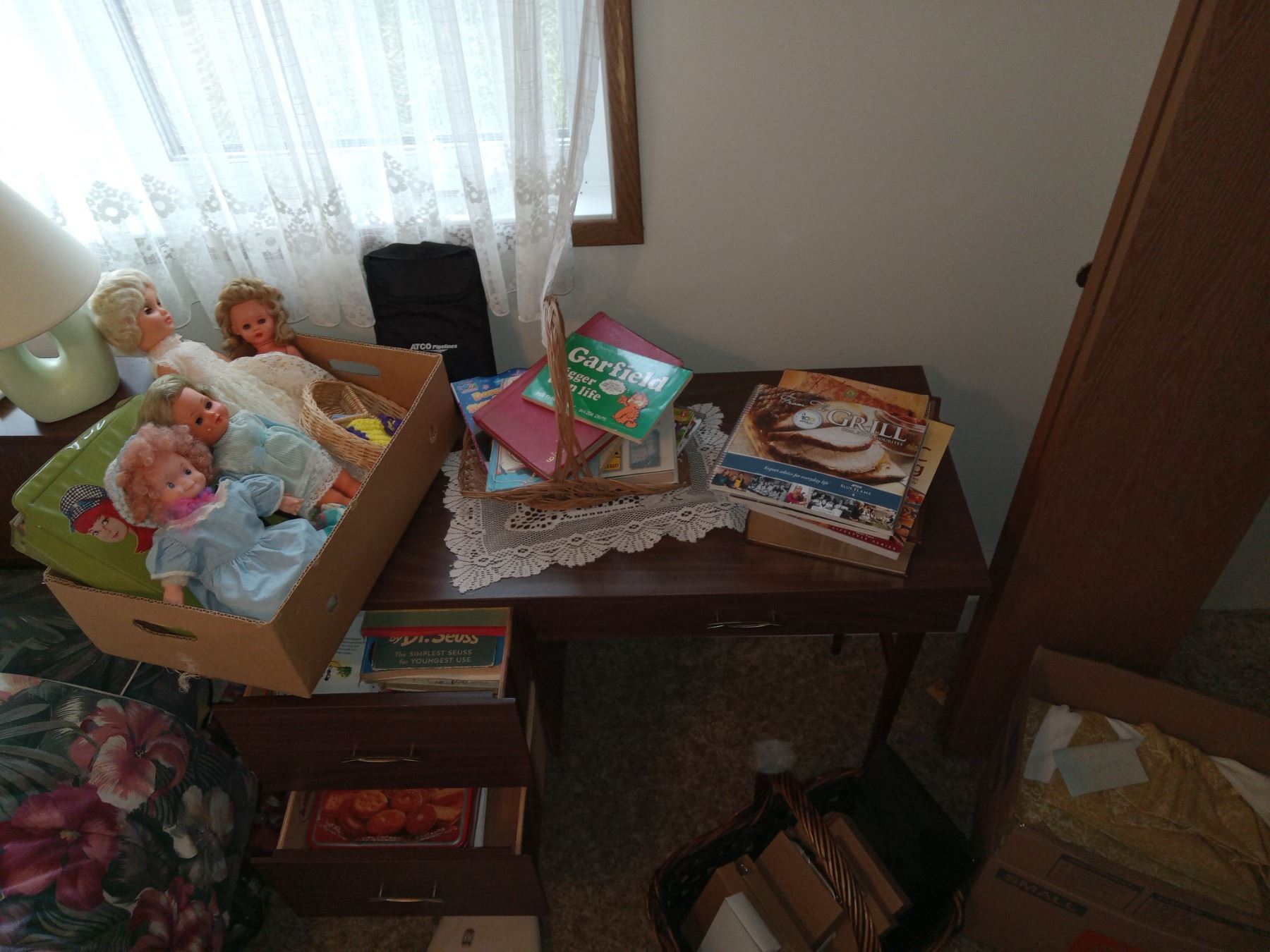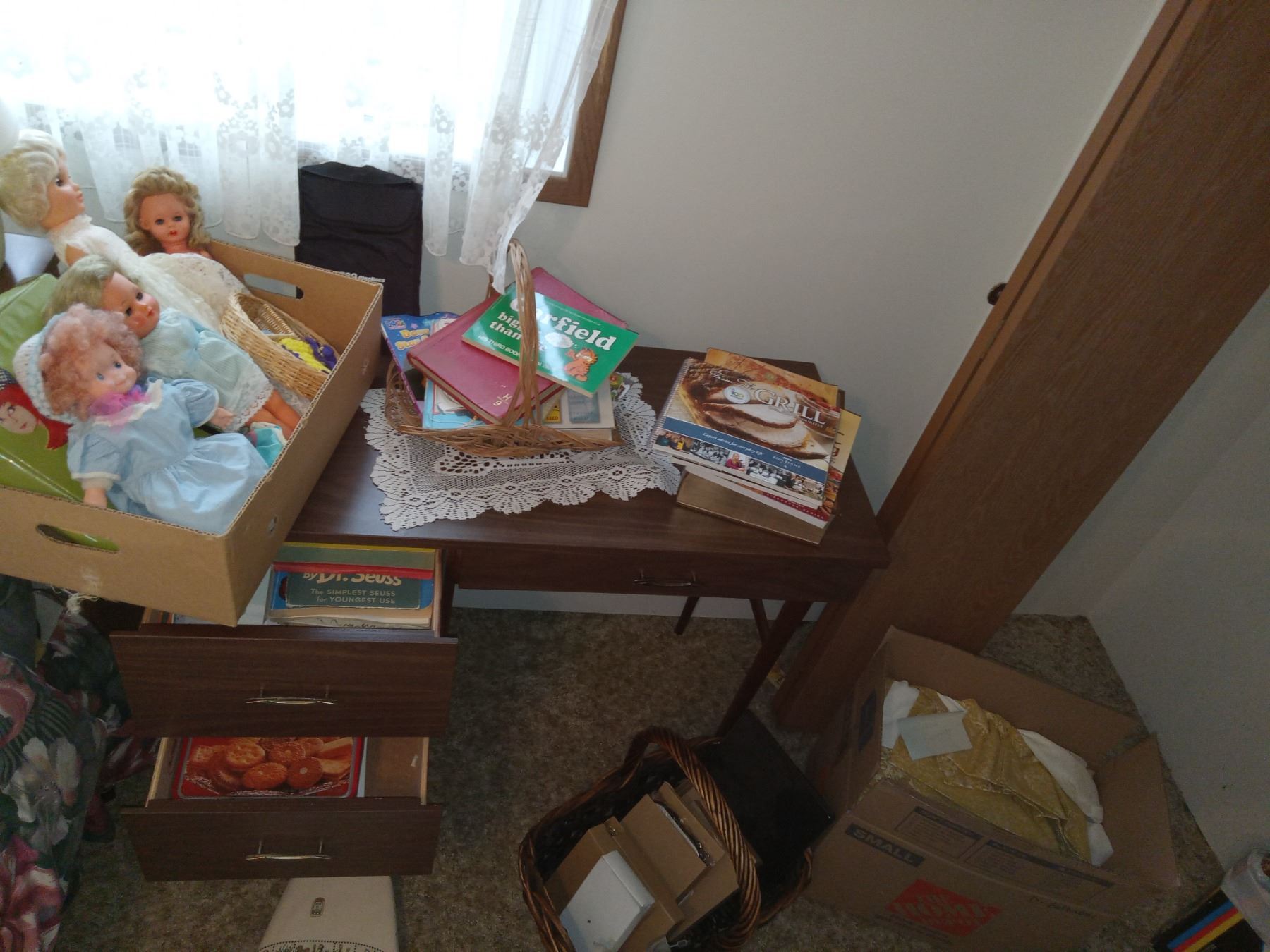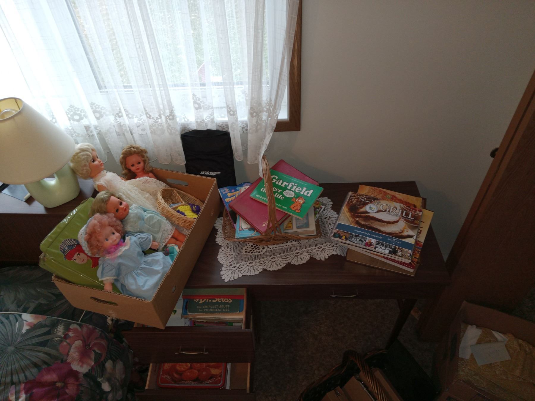 CONTENT OF & AROUND DESK & CLOSET, INCLUDES BOOKS, DOLLS, RECORDS, WINDOW COVERS & HANGERS. EXCLUDES
