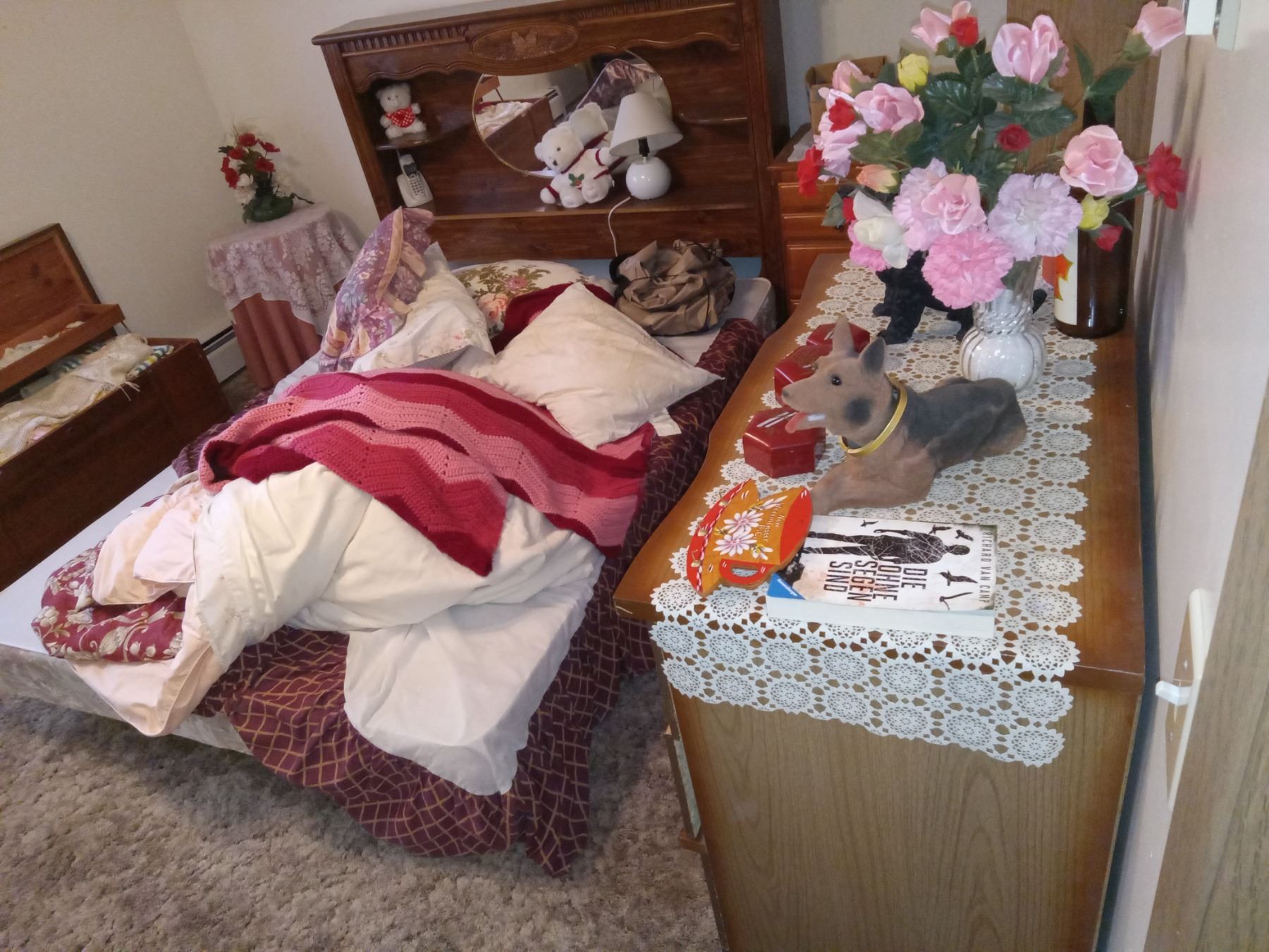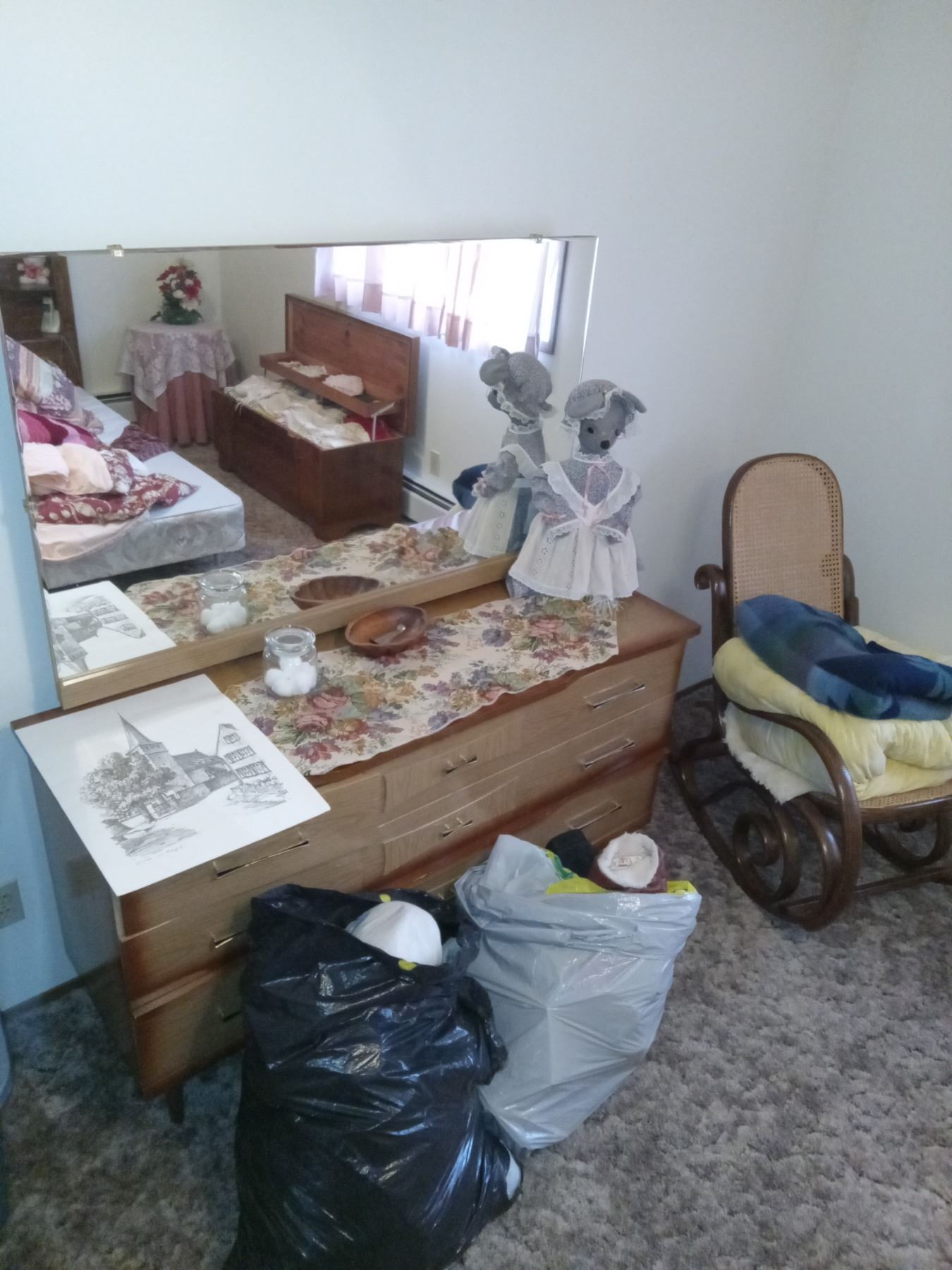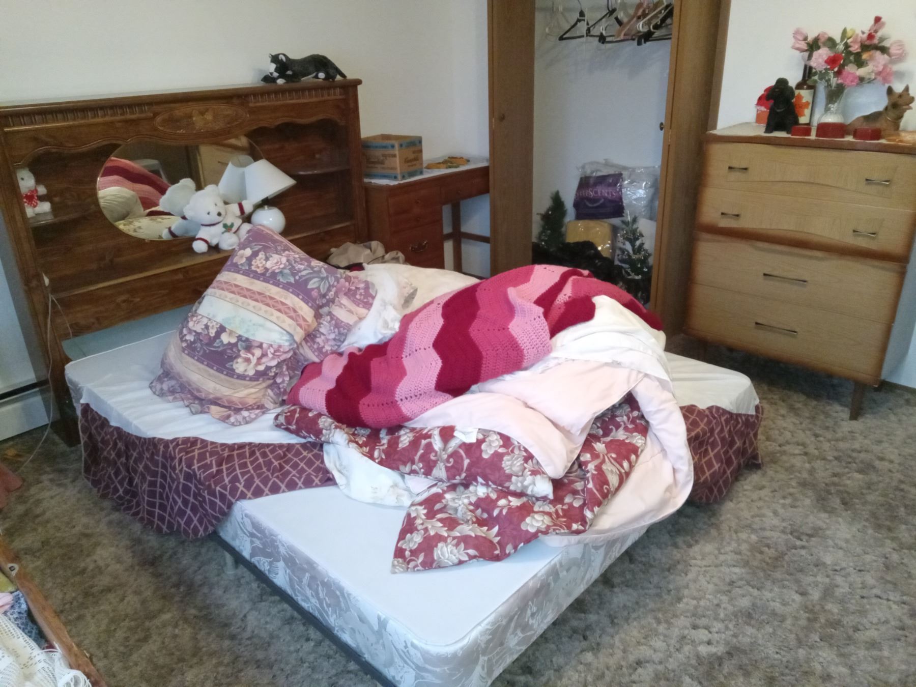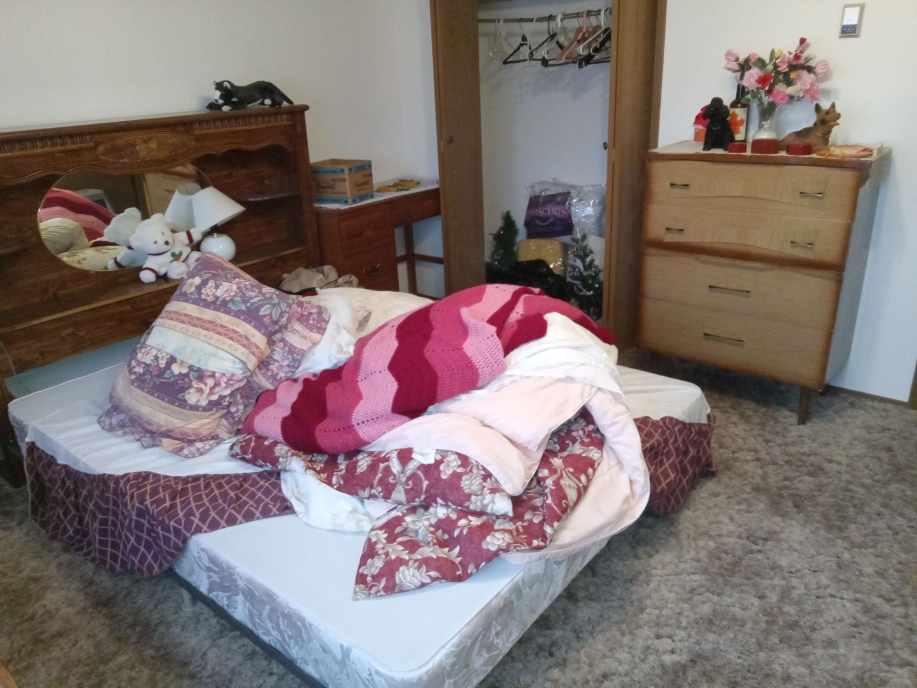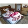 CONTENTS MASTERBEDROOM-EXCLUDES: CHEST w/ LINENS- INCL: QUEEN BED, WATERBED FRAME, DRESSERS (X2) DESK, ROCKER, TOTE OF LINENS, HATS, CHRISTMAS STUFF.