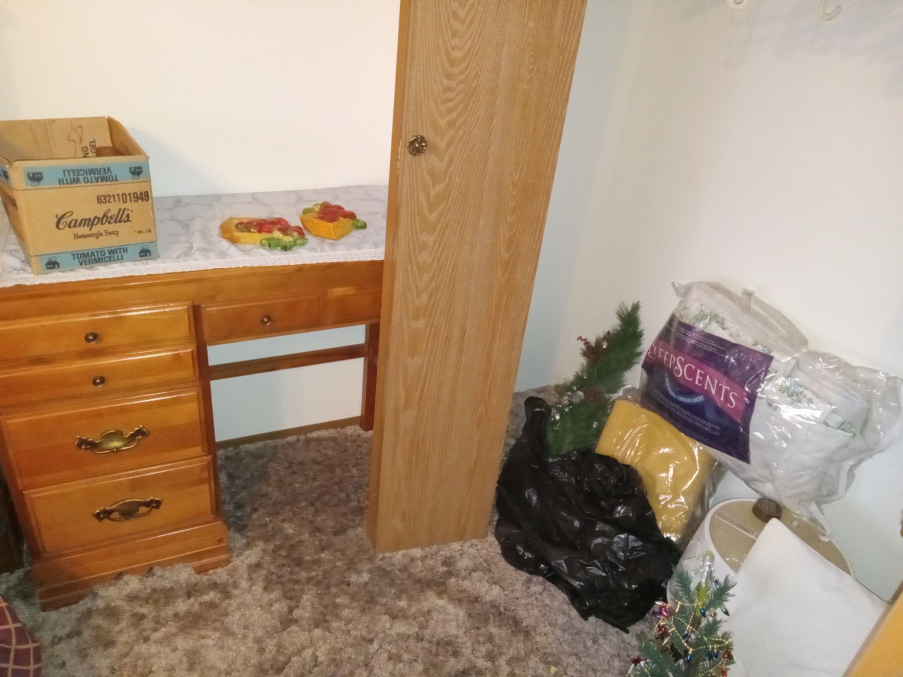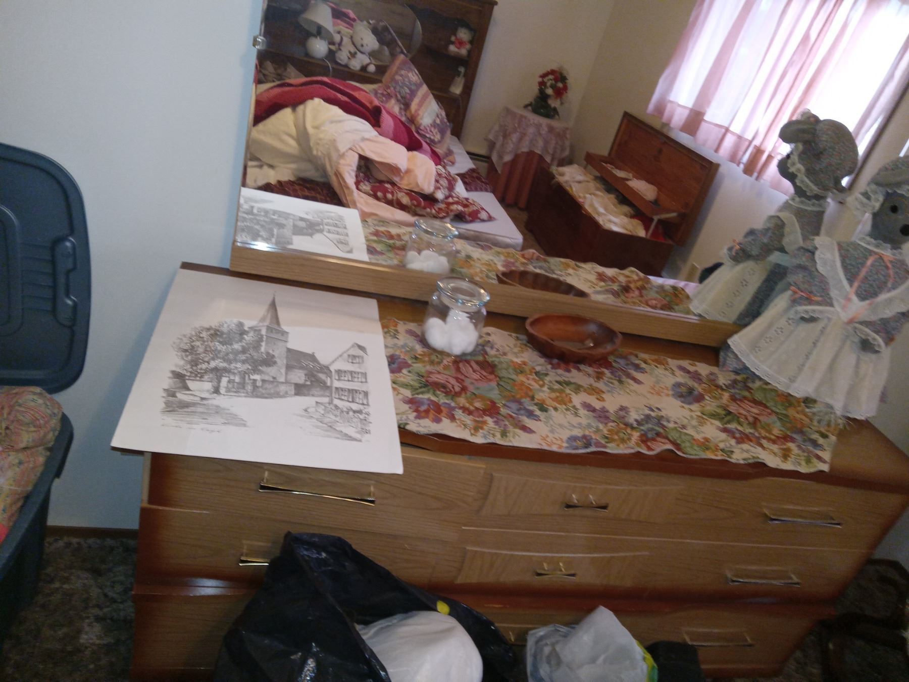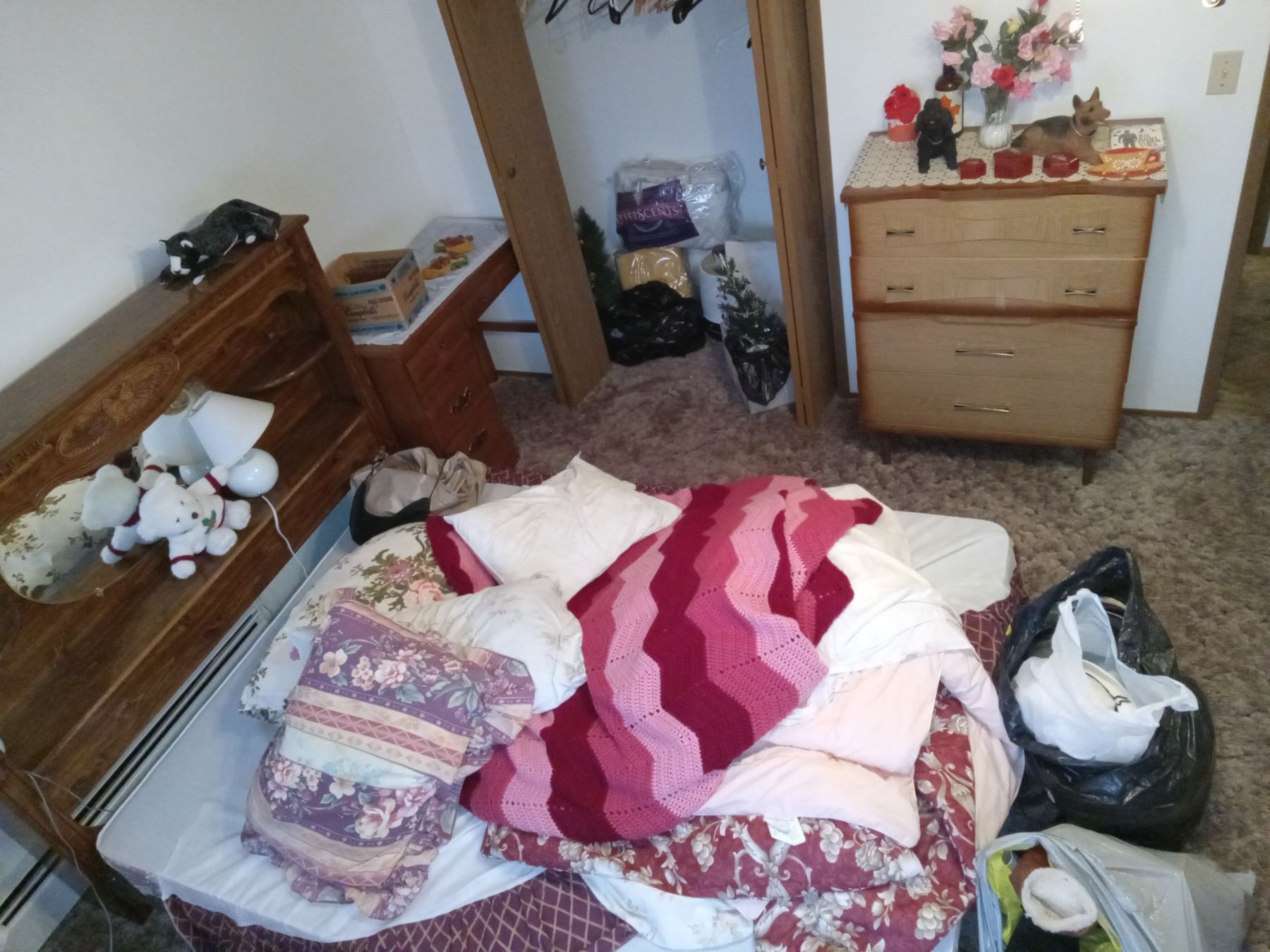 CONTENTS MASTERBEDROOM-EXCLUDES: CHEST w/ LINENS- INCL: QUEEN BED, WATERBED FRAME, DRESSERS (X2) DESK, ROCKER, TOTE OF LINENS, HATS, CHRISTMAS STUFF.