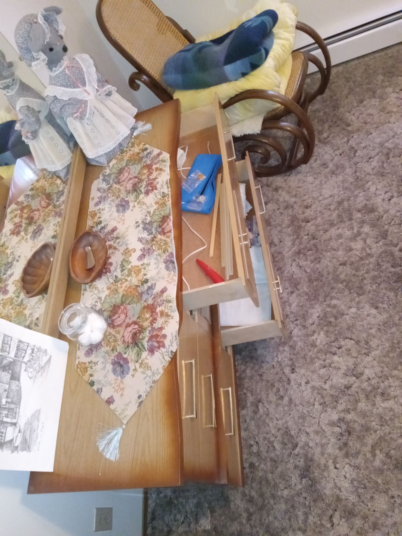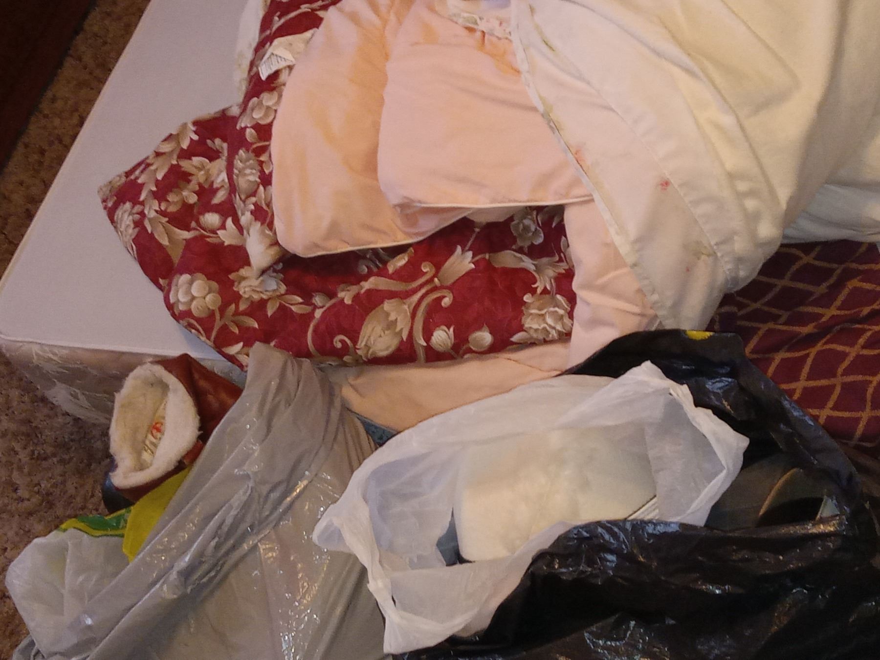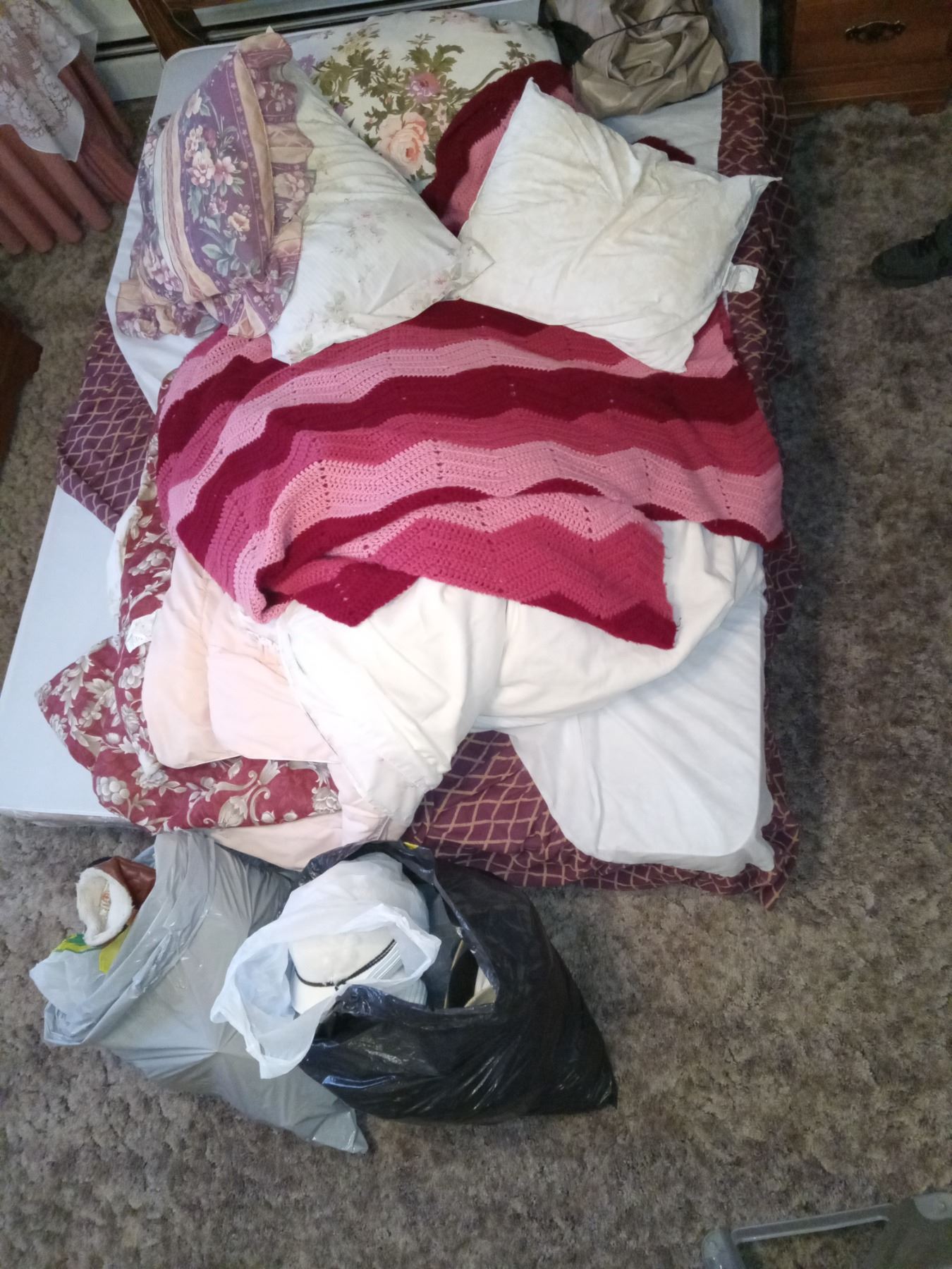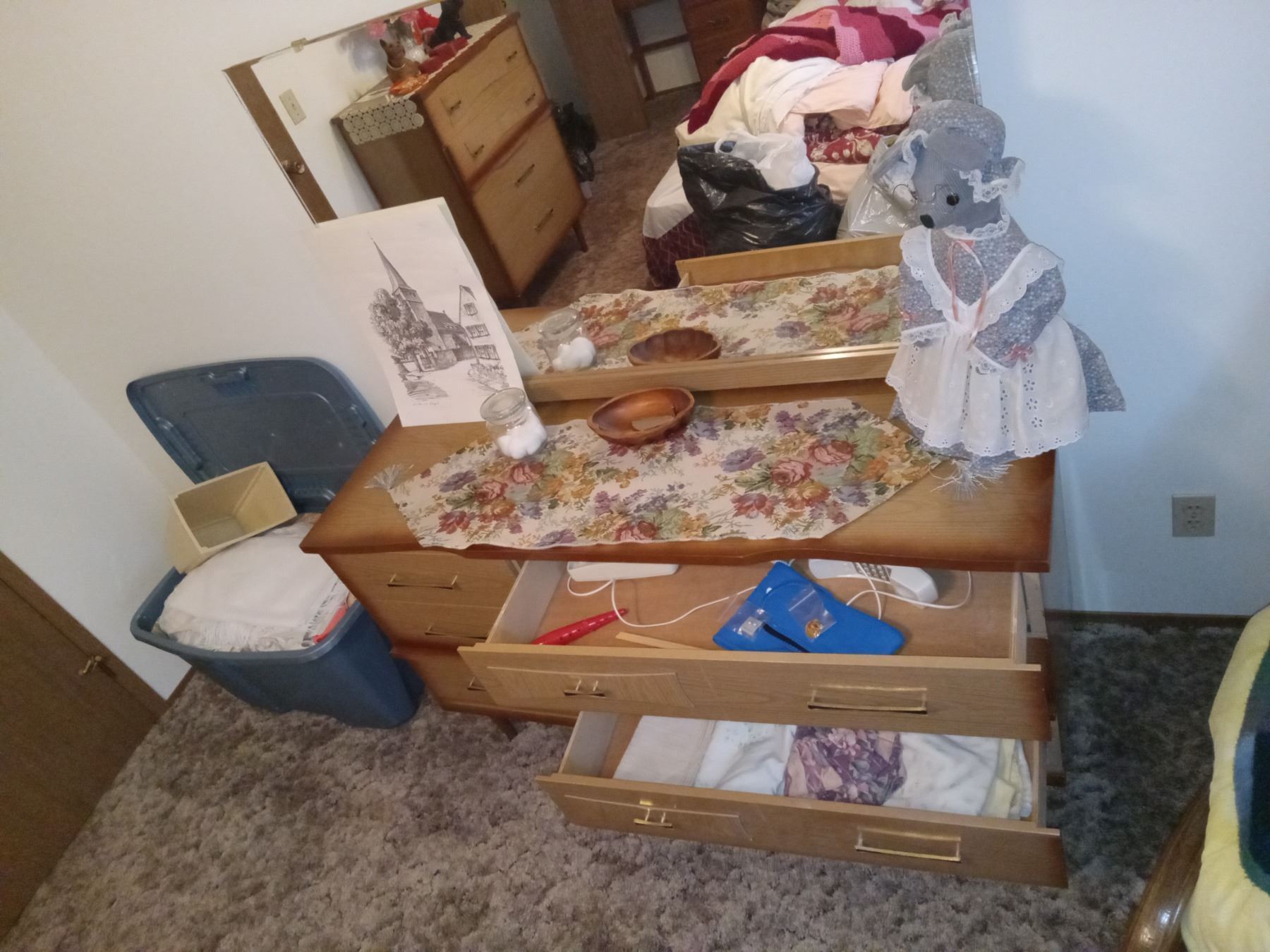 CONTENTS MASTERBEDROOM-EXCLUDES: CHEST w/ LINENS- INCL: QUEEN BED, WATERBED FRAME, DRESSERS (X2) DESK, ROCKER, TOTE OF LINENS, HATS, CHRISTMAS STUFF.