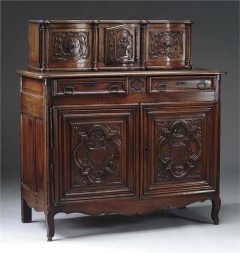 CONTINENTAL 18TH CENTURY TWO PART CARVED WALNUT CUPBOARD. In two sections. The smaller top section has a central locked door with key flanked by two slides which open to reveal a shelf interior. Each having vine carving and half fluted columns. The central door with panel of tall basket with roses. The iron decorative pulls and hardware are very nice. The bottom main section has two side by side drawers with original locks and key present. Each fitted with two decorative iron bale handles. Under which are two large carved doors each with central raised panel of classical urn with flowers framed by a nice molding. Behind which are two shelves. All raised on two French style carved legs and block back legs. Sides with three raised panels. A fabulous piece of carved furniture with great patina. SIZE: 59” h x 25” d x 55-1/2” at widest. CONDITION: Very good with some minor repairs. 9-27233