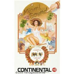 <B>Continental Airlines, Miami Beach (1974)</B></I> Travel Airlines Poster (25" X 40"). Retro pinup waving, four engine jet plane, Dolphins playing football, historical figures, high-rise hotel with beach and 3+2 seating illustration. The frantic activity within this poster was no doubt an attempt to indicate that there was a lot to do in Miami. A classic example of 70s post Peter Max glitz. Artist Ignacio Gomez. Very Fine condition.
