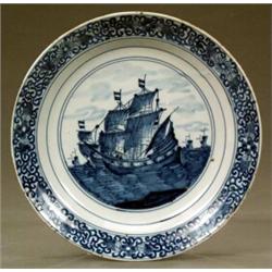 CONTINENTAL CERAMICS - A Delft saucer dish, painted with fleet at sea and border of flowers in b...