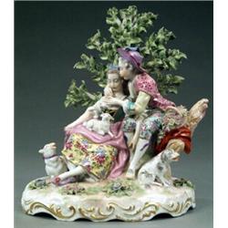 CONTINENTAL CERAMICS - A late Meissen group of seated lovers before a tree stump, the flower enc...
