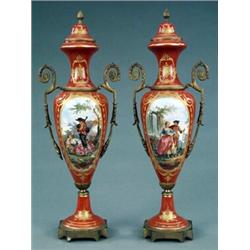 A pair of French slender baluster vases, painted with lovers in landscapes in oval reserves on an iron red ground gilt with flowers scrolls and pendants, metal handles, bases and finials, 21.5in high